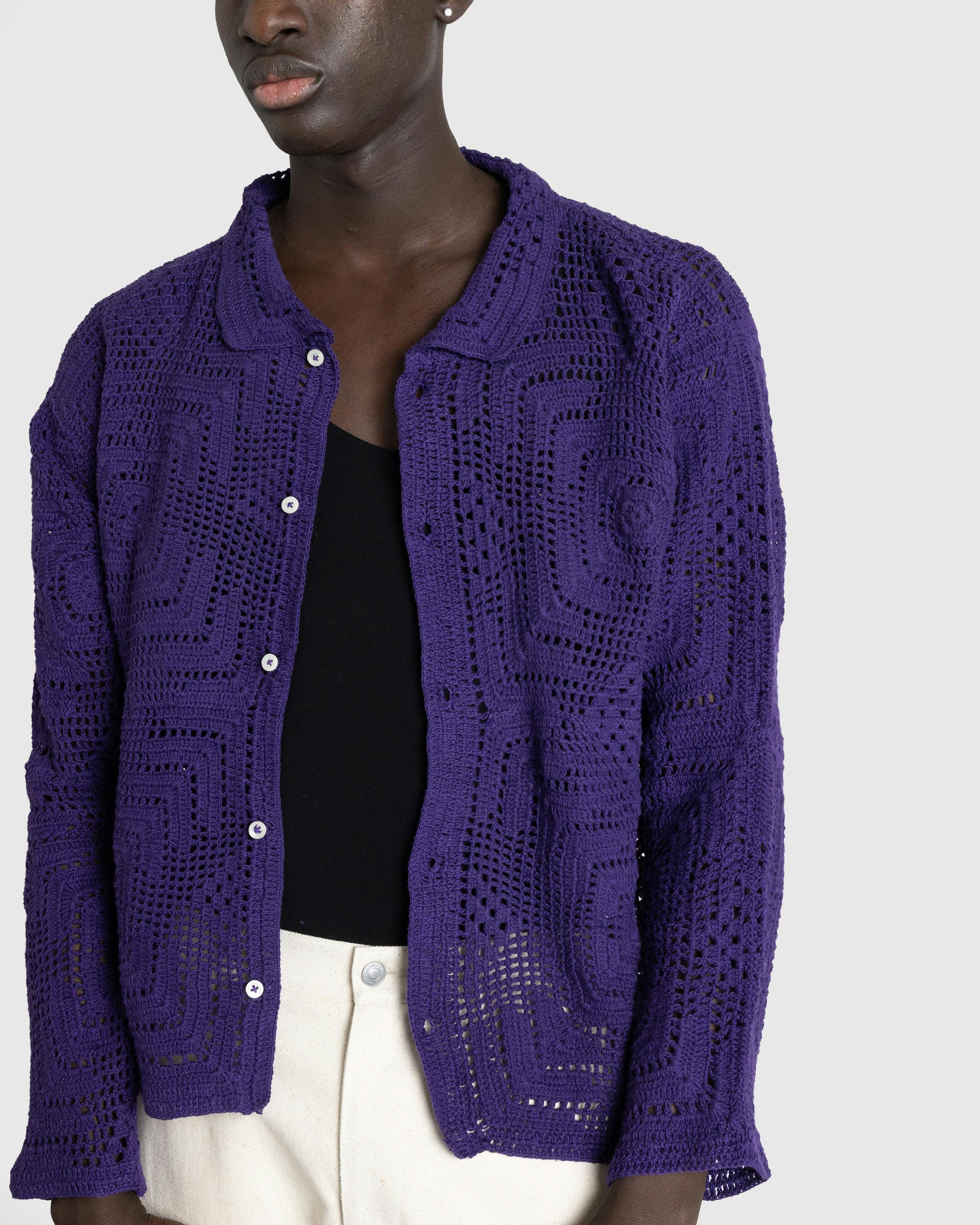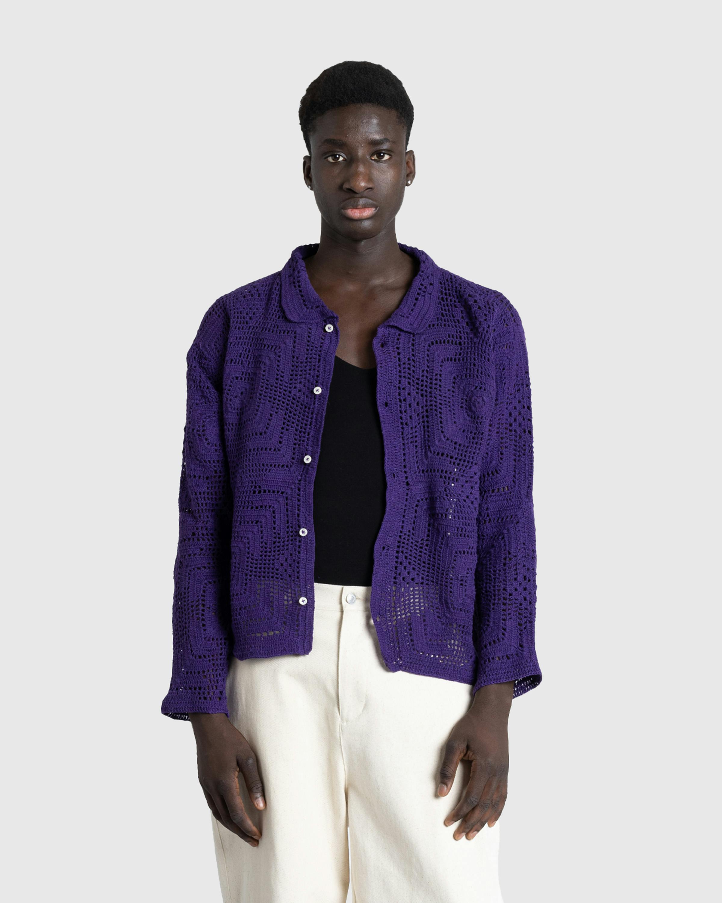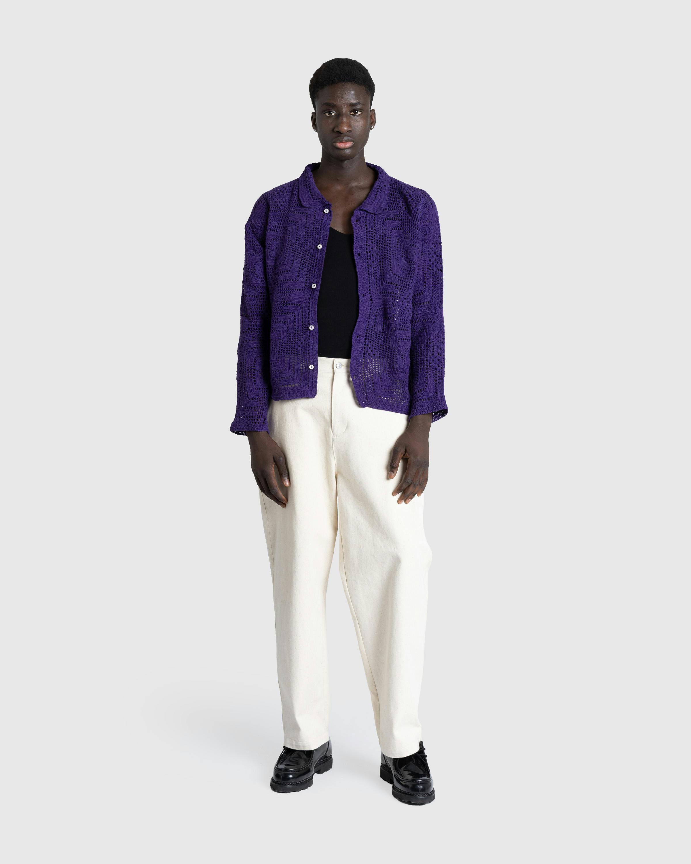 The Crochet Overshirt draws inspiration from crochet tablecloths popular throughout the 1930s-1940s. The garment is defined by an intricately crocheted all-over pattern that brings the piece to life. It has a spread collar, full front button fastening, and a straight hem, and is cut for a slim, slightly cropped fit.