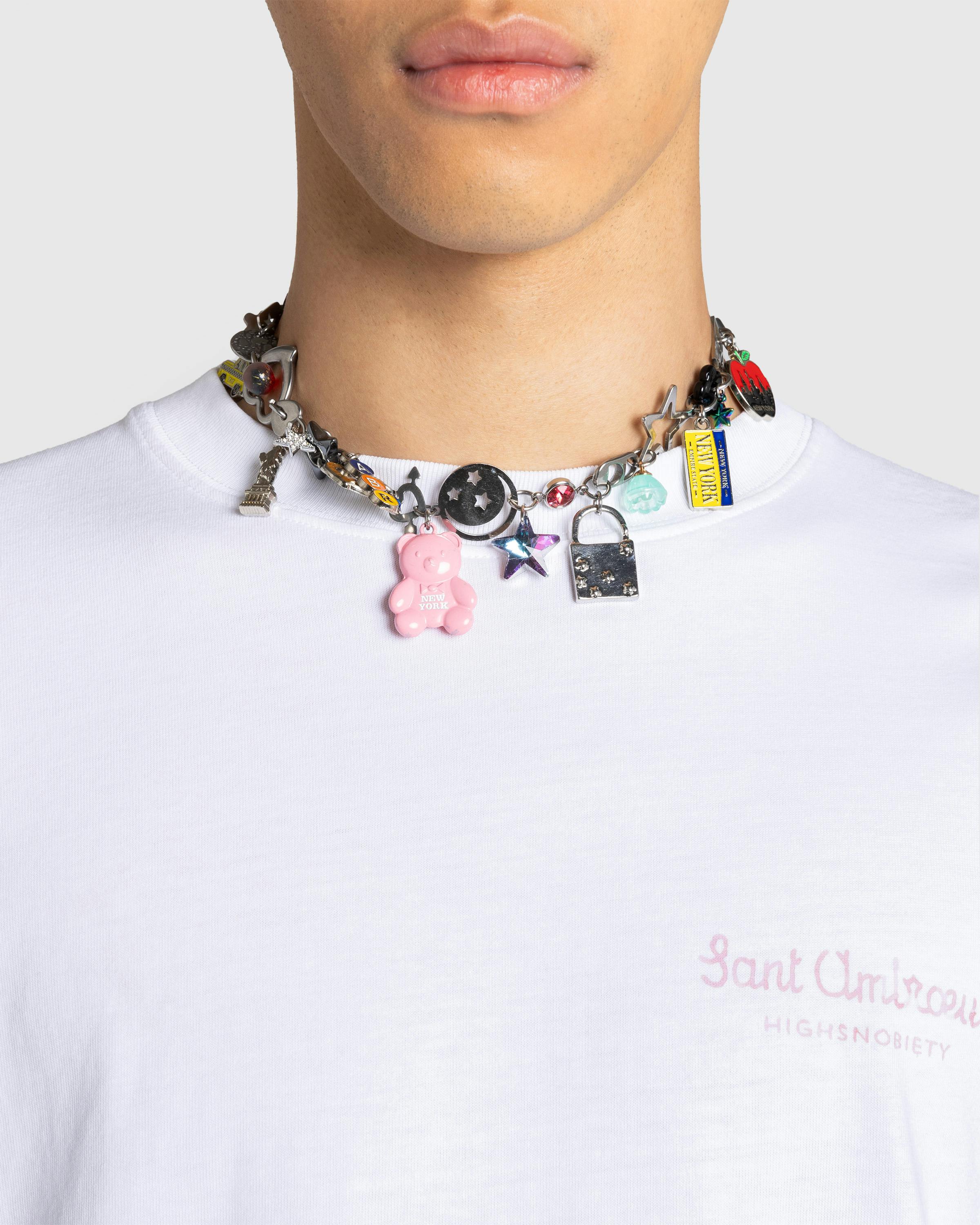 The NYC Charm Necklace is a captivating jewelry style by Marland Backus made for our Not In New York collection. Handcrafted from a mix of brass, stainless steel, and glass, the necklace is adorned with a range of charms that celebrate the city and features gold accents with natural stones.