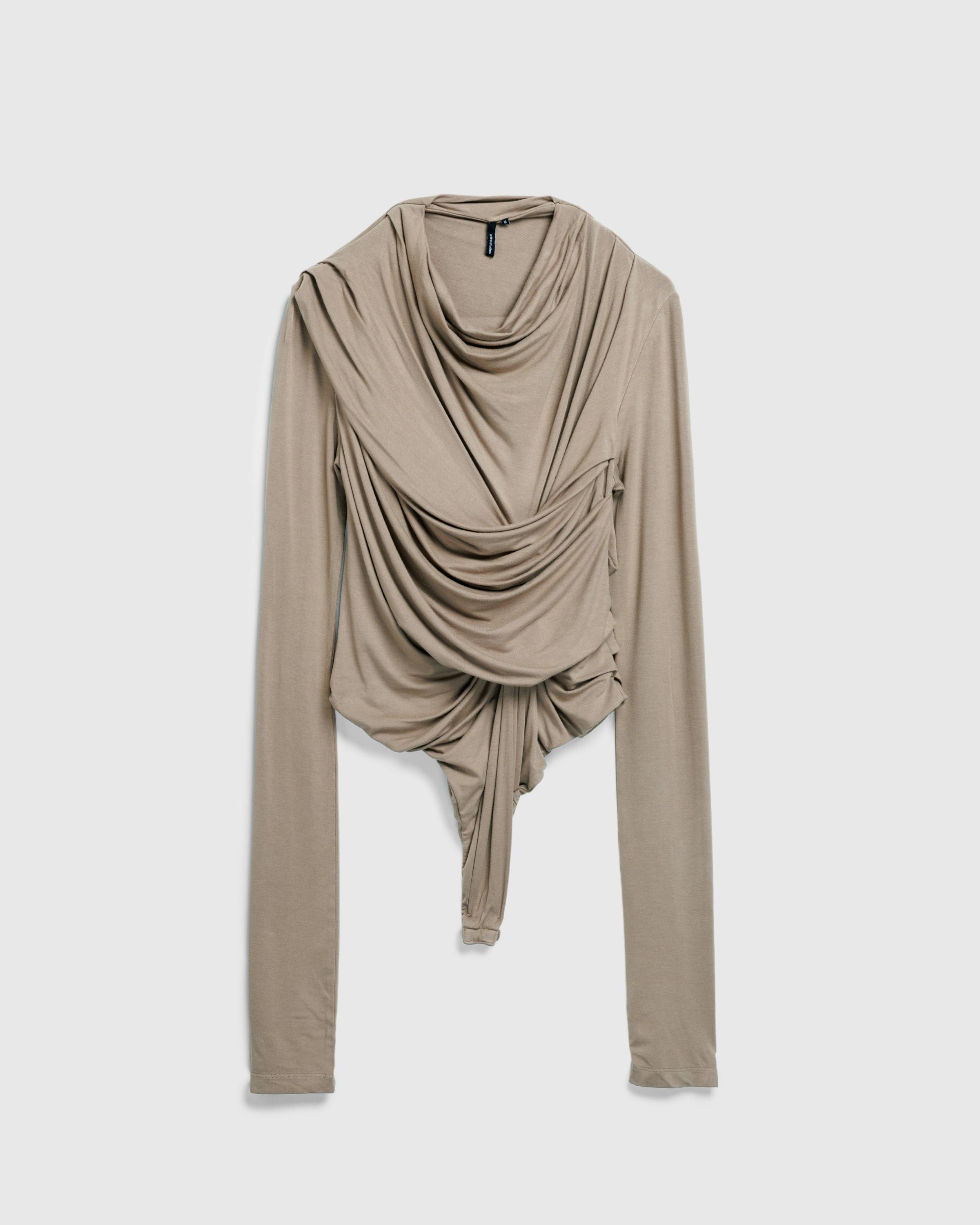 The Encase Bodysuit is an Entire Studios basic style capable of being worn on its own or paired with other garments. It is constructed from a soft and lightweight viscose-elastane blend fabric, featuring a draped neckline, long sleeves, and crotch snap domes. Gathering and tuck details bring a bit of dimension to the fitted silhouette.
