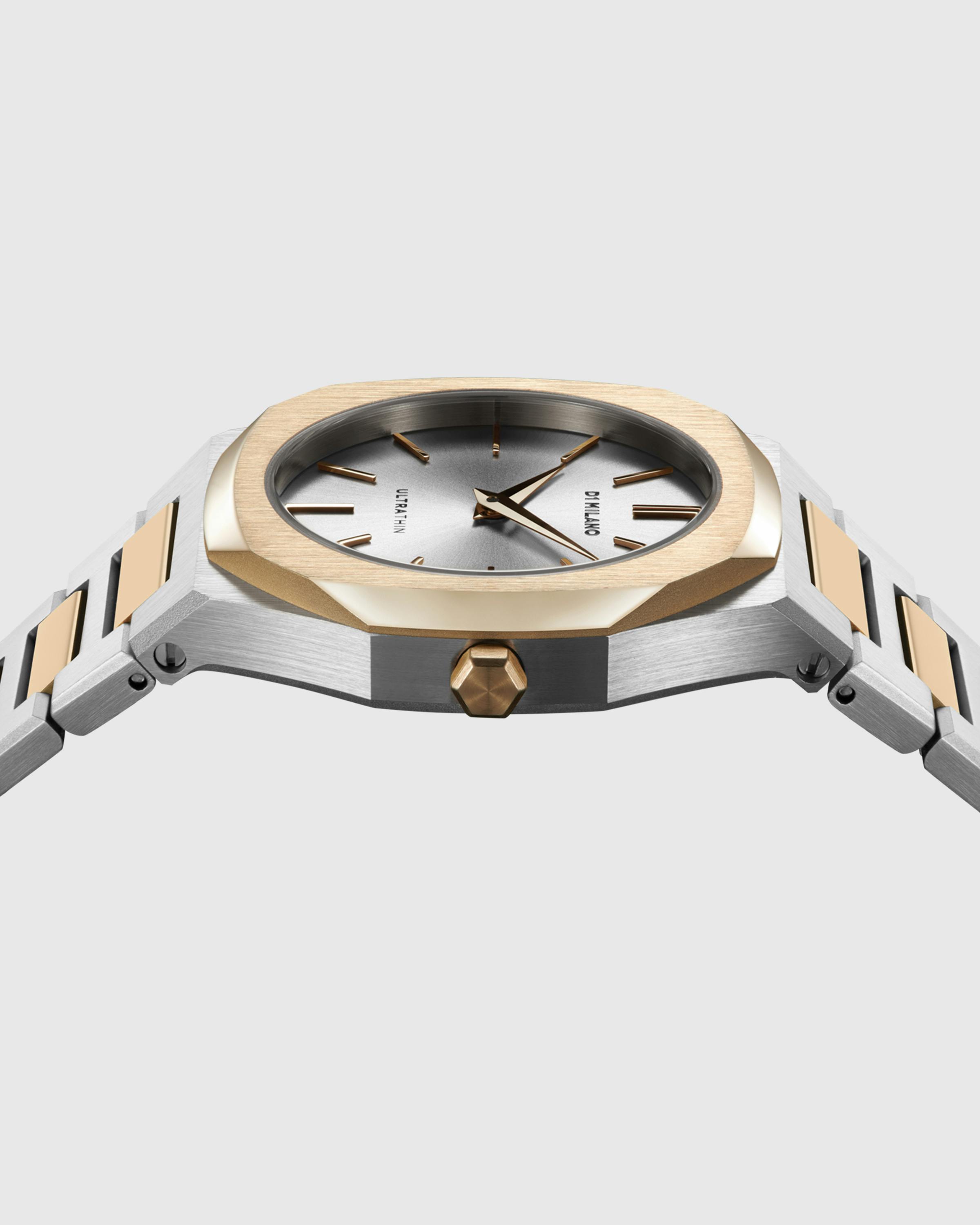 With the Ultra Edge, D1 Milano redefines elegance in a compact size. It features a refined new case size of 30mm, pairing a bicolor silver and gold stainless steel bracelet with a sunray silver dial with gold indexes. Designed to stand out, the Ultra Edge is a thin eye-catcher that adds a touch of irreverence to your watch collection.
