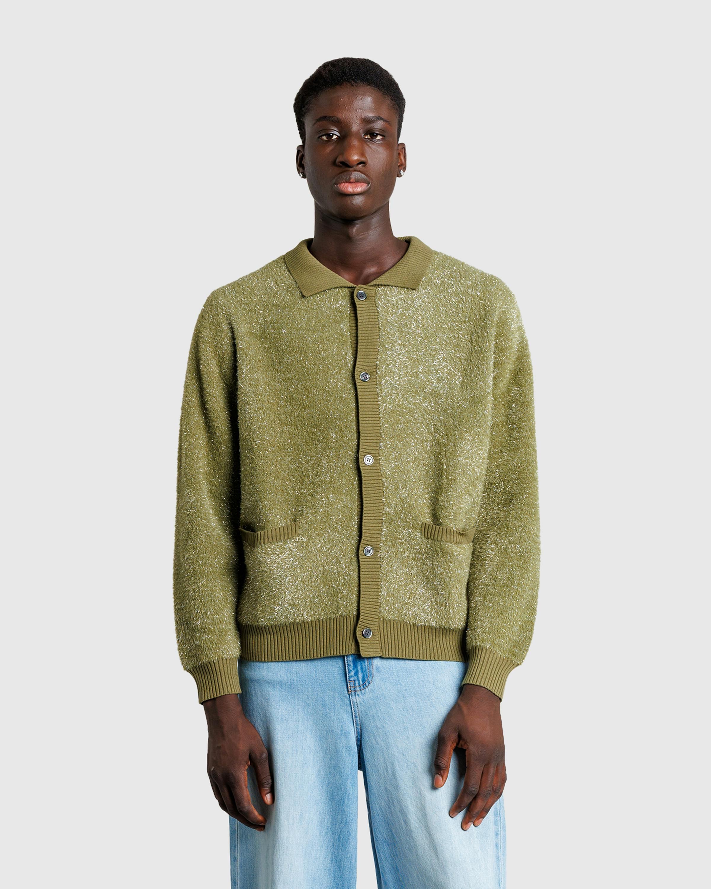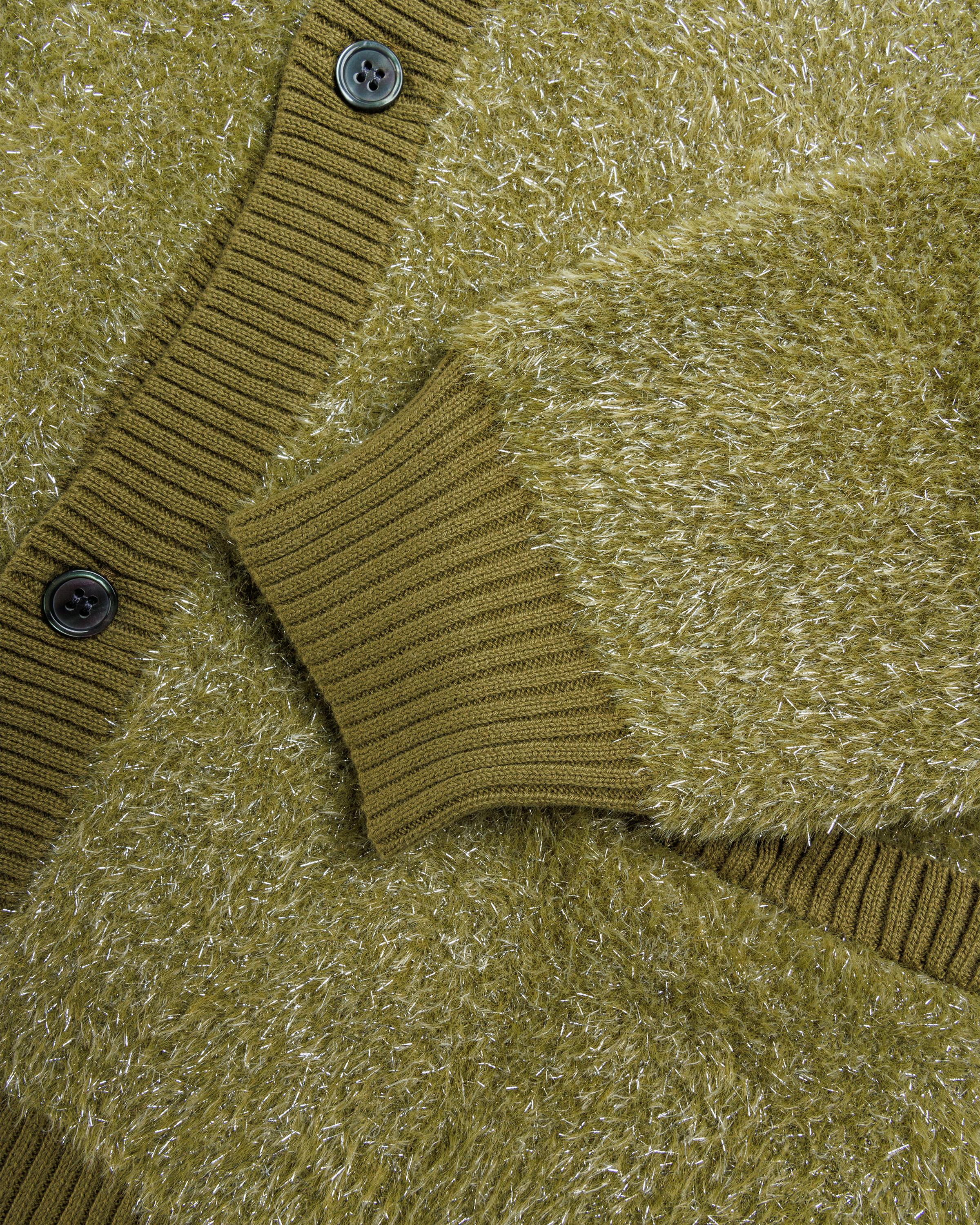 Designed to hit the town, the Big Night Out Cardigan is an elevated, streetwear-flavored take on a familiar style. It features a Lurex glitter yarn body that gives the piece a distinctive appearance, with rib knit trims at the collar, cuffs, and hem. Additional design elements include full front button fastening and two lower welt pockets, as the garment is cut for a comfortable, boxy fit.