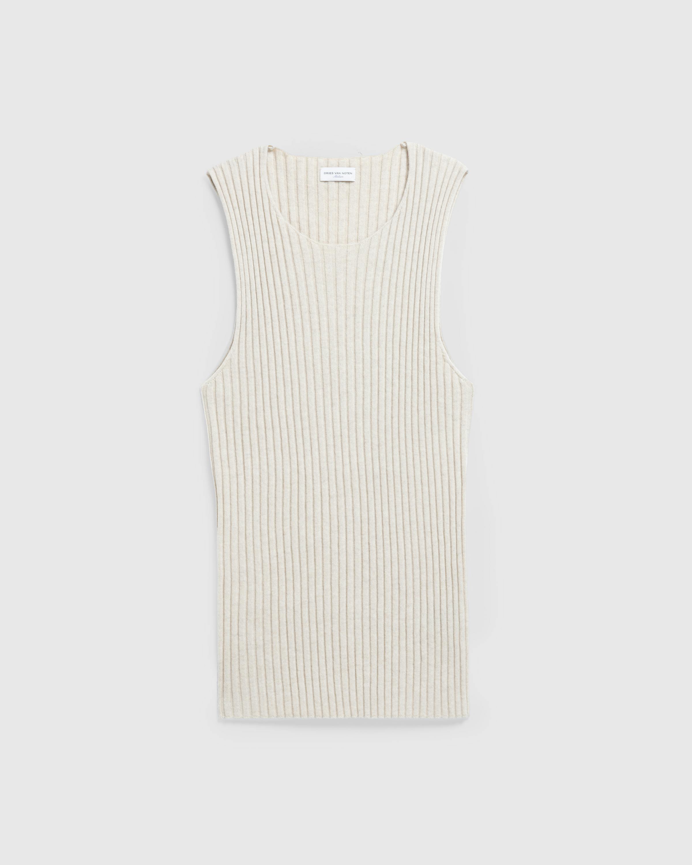 This monochromatic Dries van Noten top is rib knit from a soft cashmere fabric and cut for a fashion-forward fitted wear. It is sleeveless and features a round neckline and a straight hem.