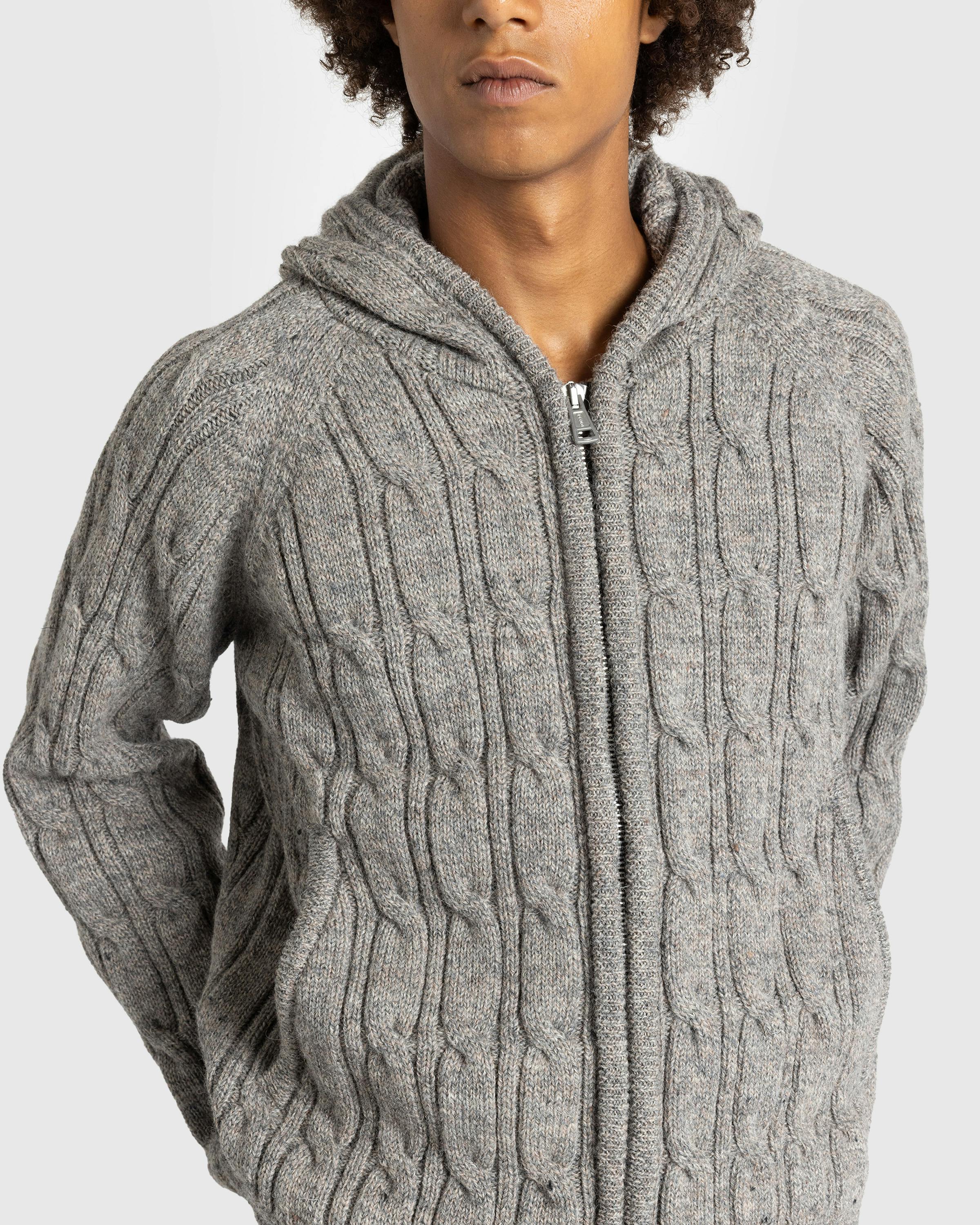 The Level Hood is a cozy outerwear style cable knit from an English pure new wool yarn. It is cut for a relaxed, boxy fit and features a fixed hood, two-way front zip fastening, and ribbed trim at the cuffs and hem. Patch pockets are incorporated at the sides of the garment to complete the design.