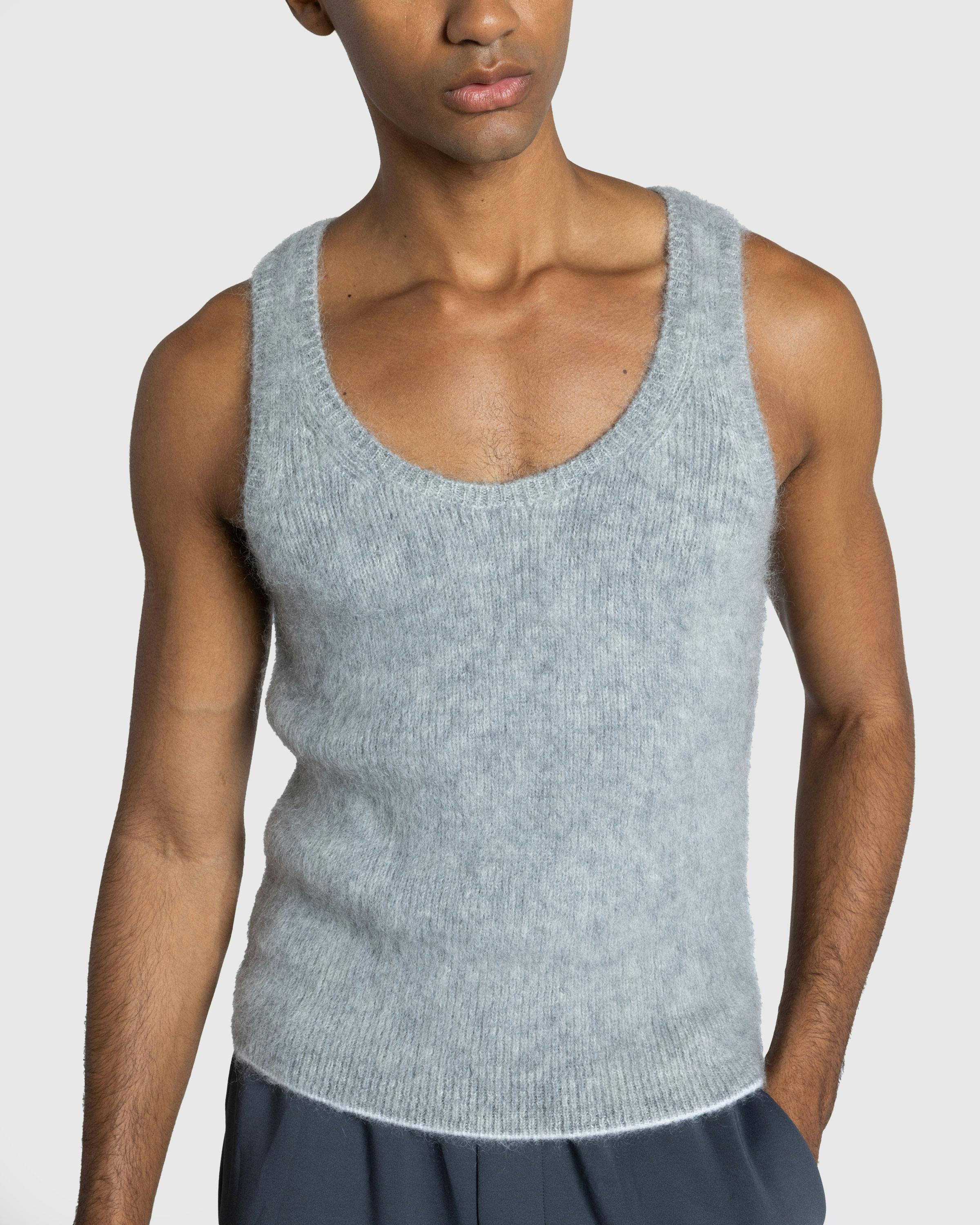 Le Débardeur Pitatto is a fluffy knit tank top style by Jacquemus. Executed in a soft mohair knit, the sleeveless garment features a contrasting hem and plunging round neck. It has a fitted shape and is finished with a fisherman logo tag on the back.