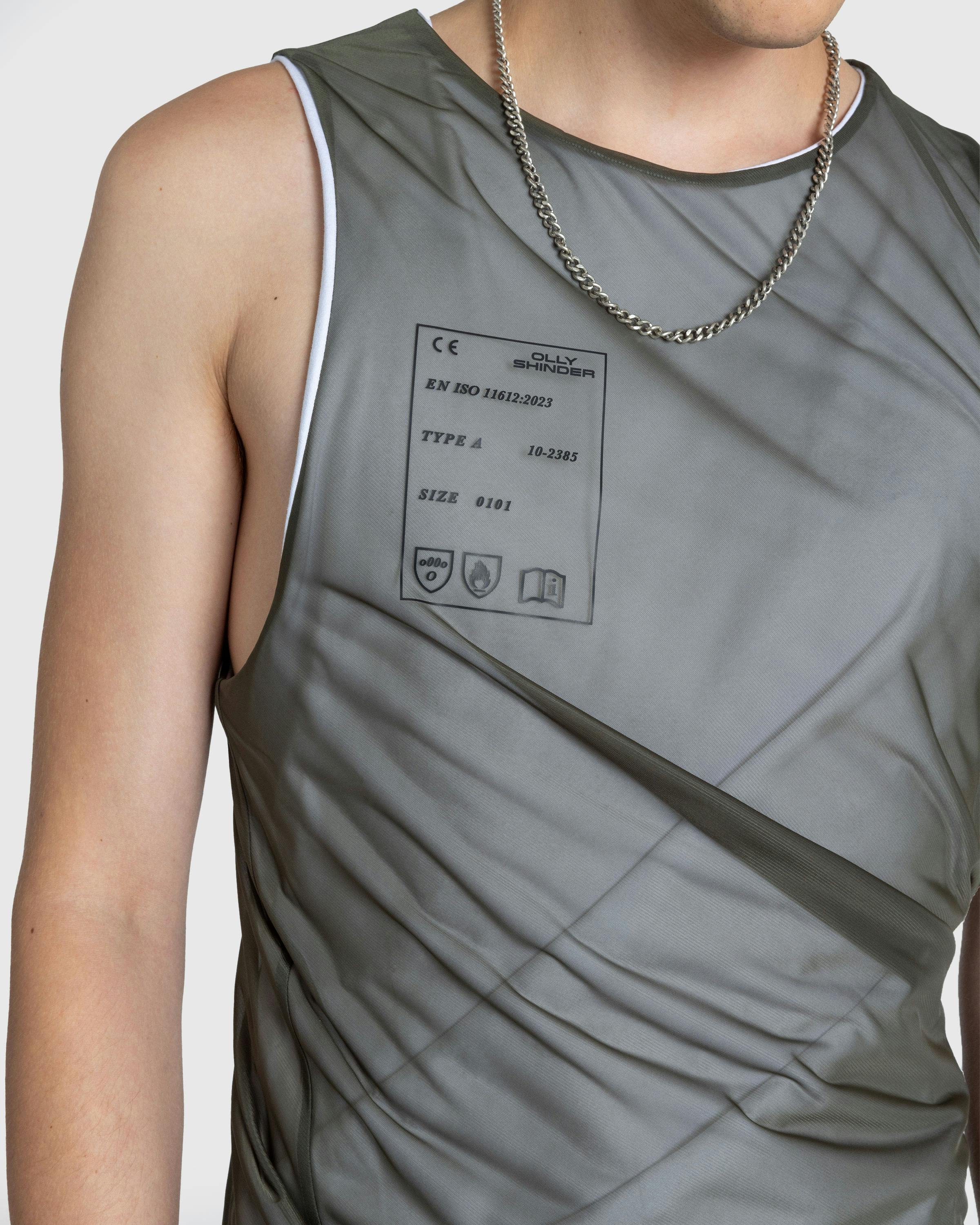 The Twisted Tank is Olly Shinder's reinterpretation of a familiar shirting style. The fitted garment features double-layer construction from polyester and cotton fabrics, with twisted detailing, per the name of the piece. Additional design elements include a round neckline, a straight hem, and logo detailing implemented at the chest.