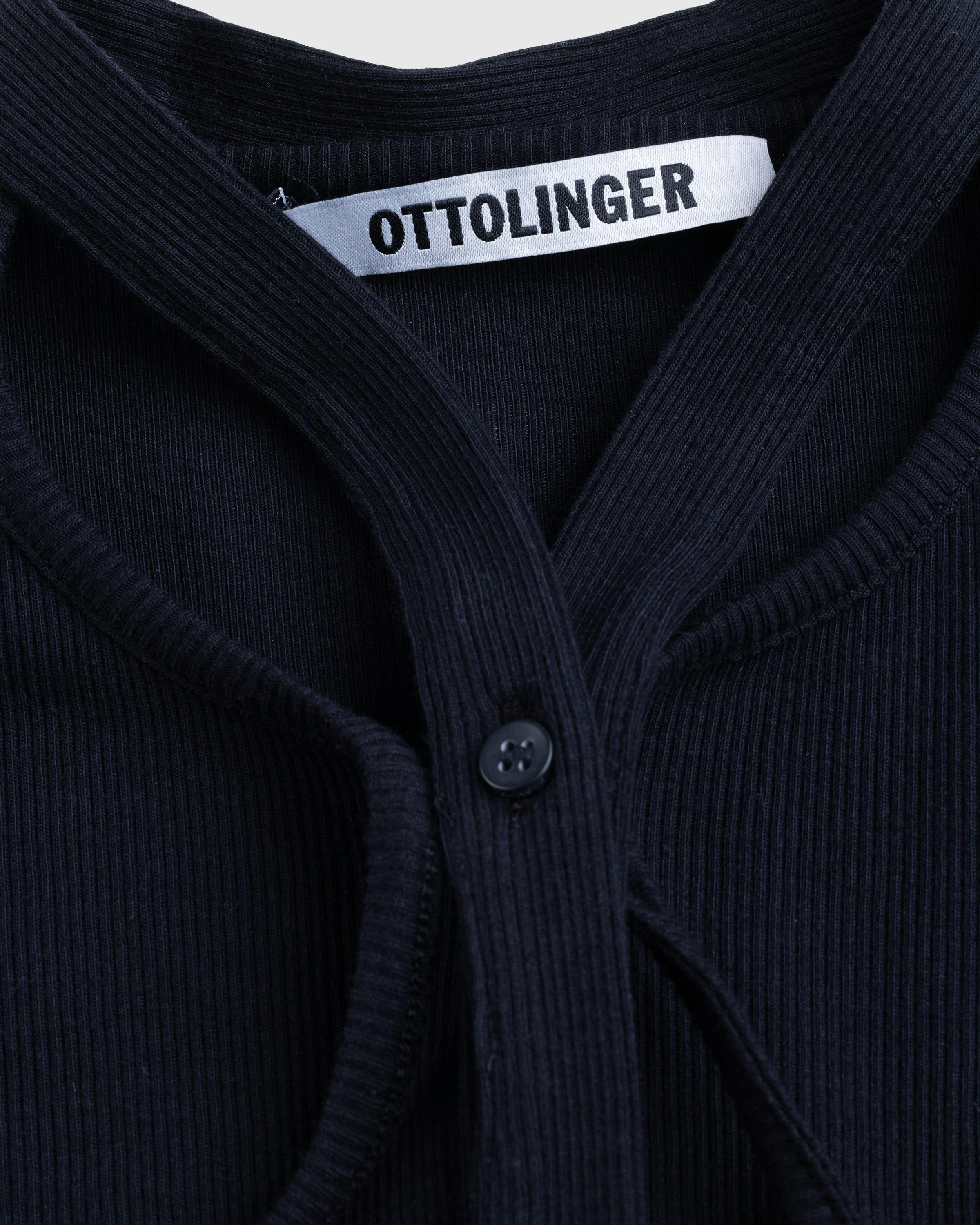 The Double Closure Rib Cardigan is a contemporary update to a familiar style. It is rib knit from a cotton blend fabric with a moderate stretch. The garment is defined by its unique strap details and a deconstructed hem. It is finished with a contrasting logo on the silhouette's back.