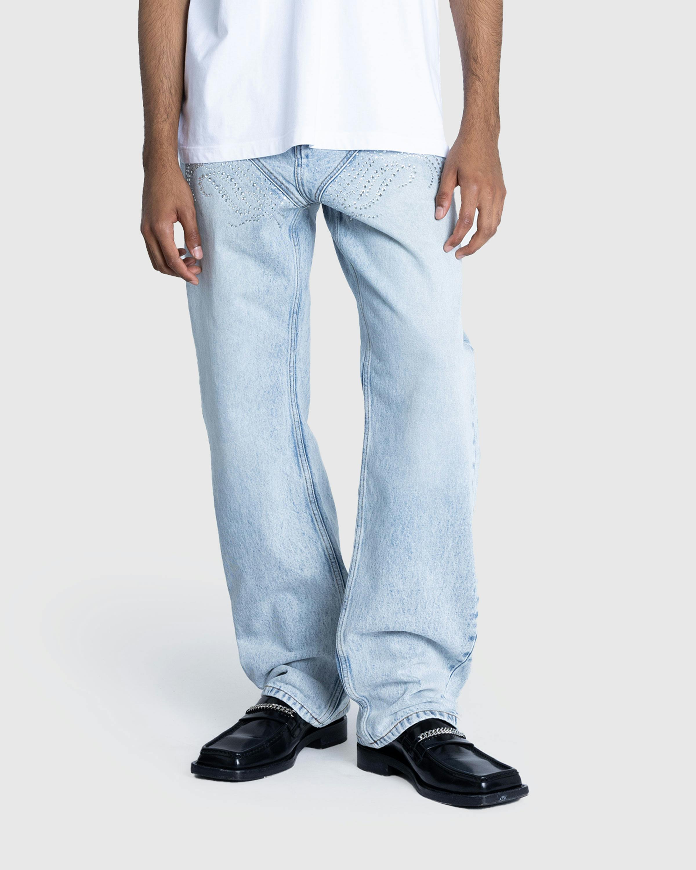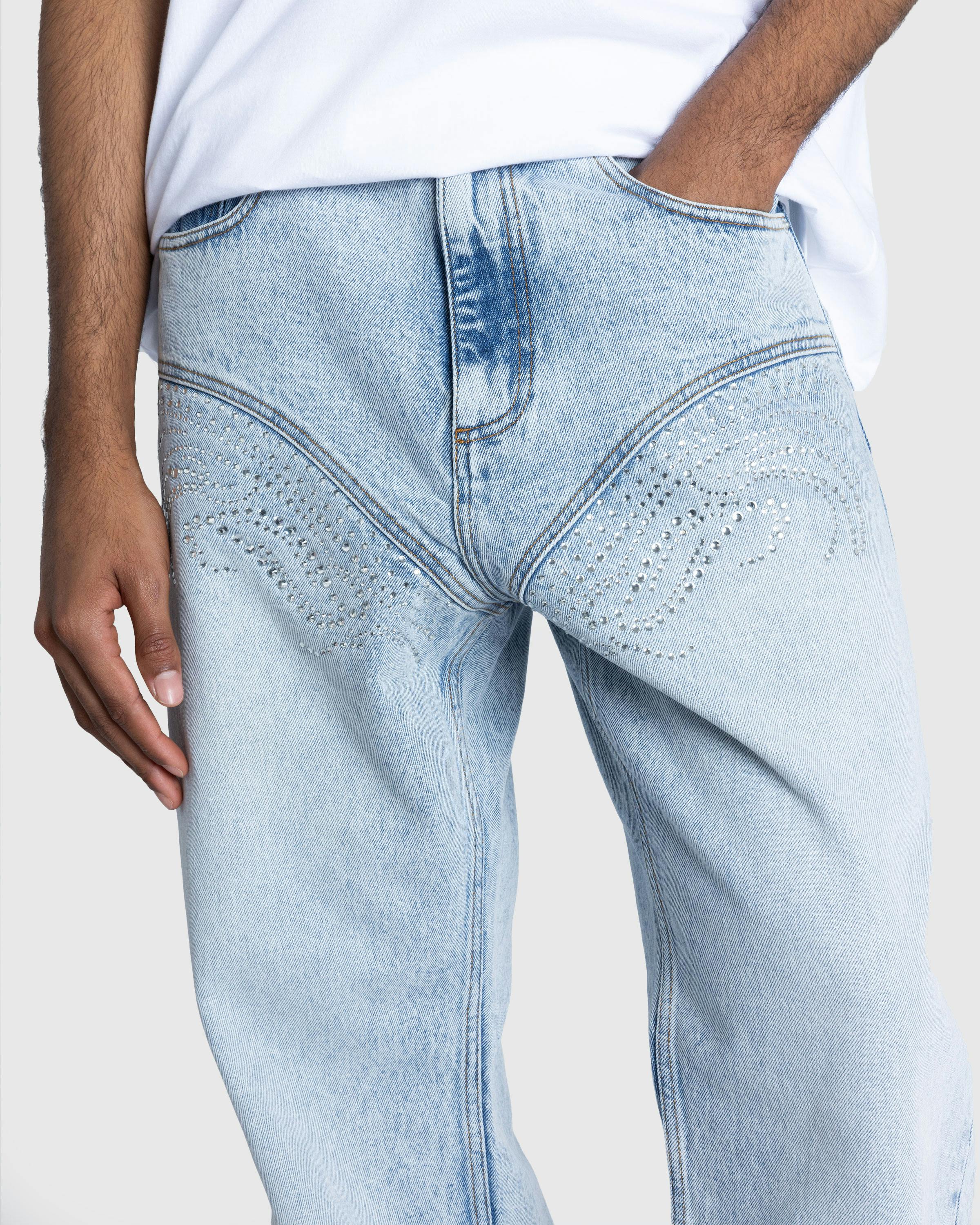 These exclusive Y/Project jeans arrive as part of our Not In Paris collection. Designed in a paneled construction with rhinestone accents along the thigh, the pair is finished with contrast stitching and a leather logo patch at the back waistband.