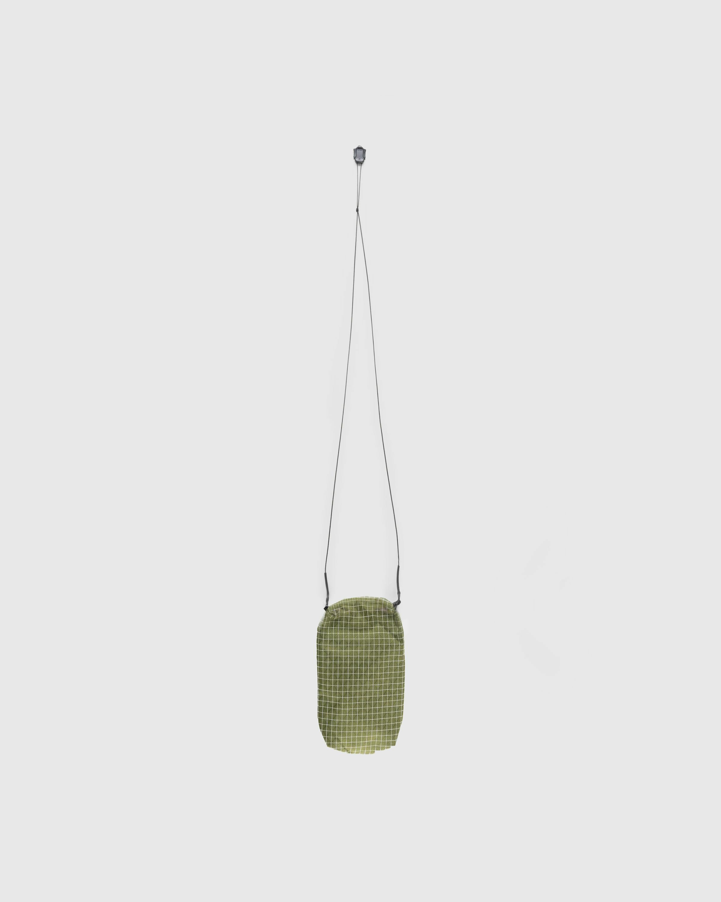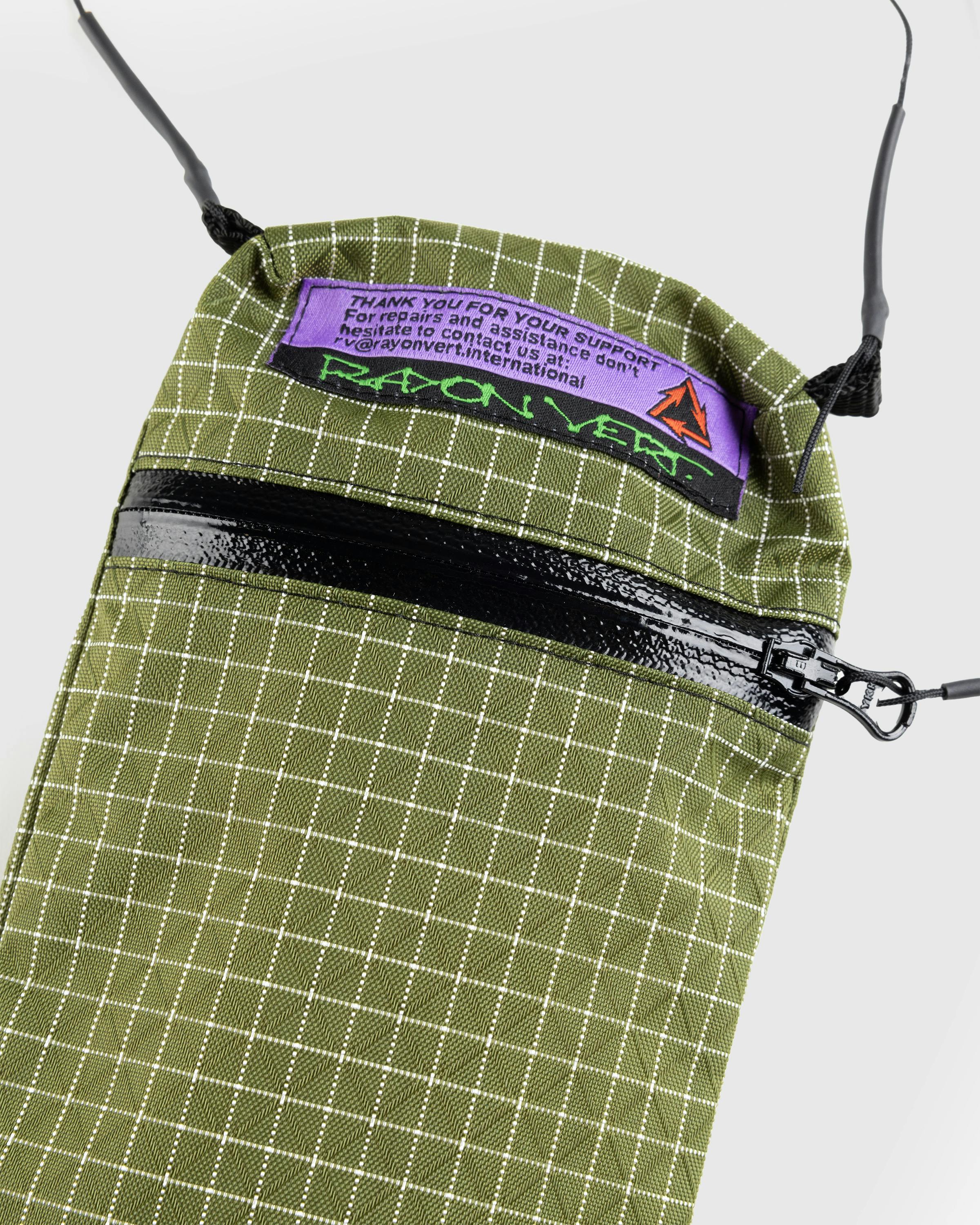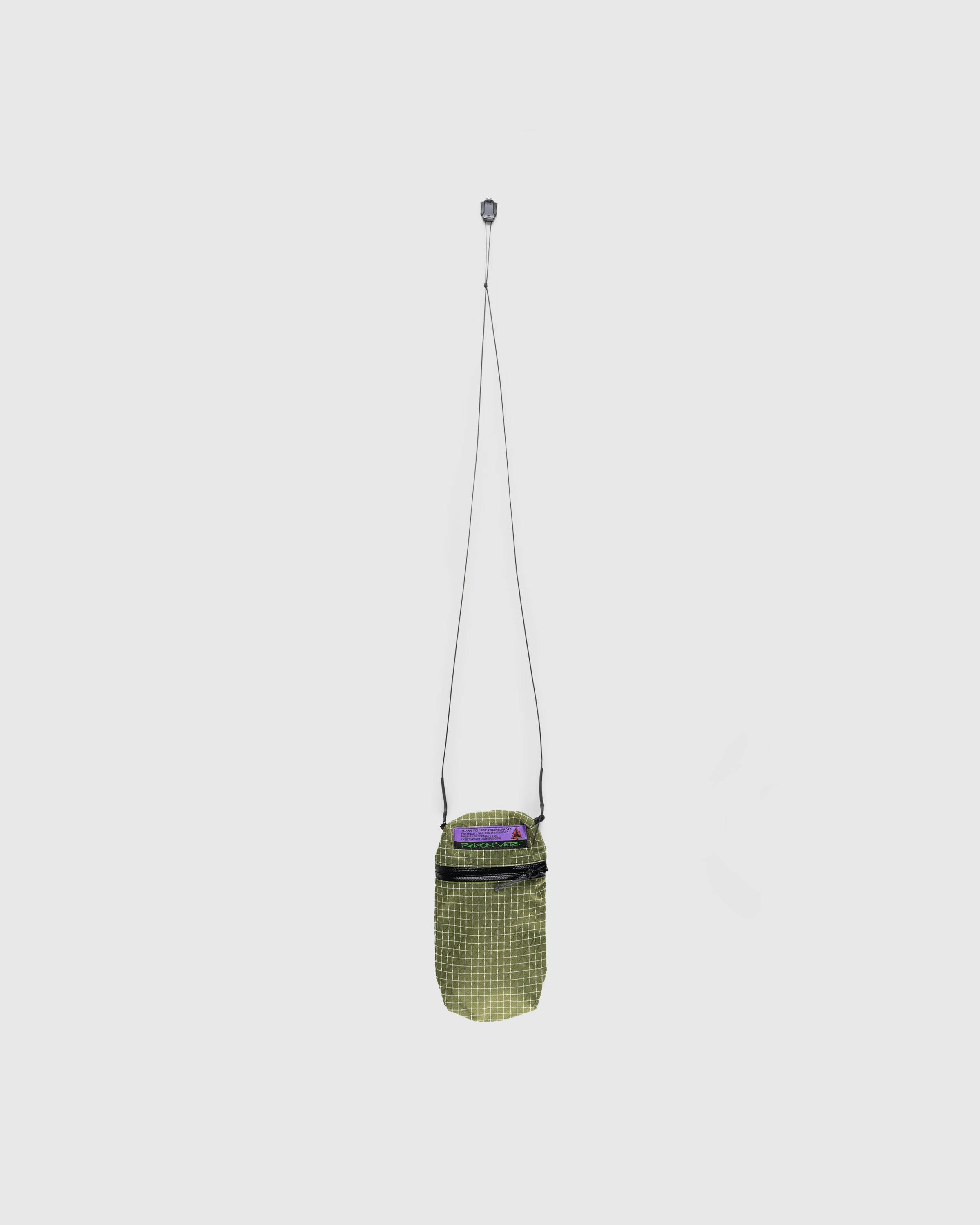 The Macaroni is a compact baggage style designed for daily use. It is constructed using a lightweight yet durable nylon and Dyneema blend material, with an all-over grid pattern. The bag has a front zipped compartment and a thin, adjustable shoulder strap, while being branded with a Rayon Vert logo patch on the front.