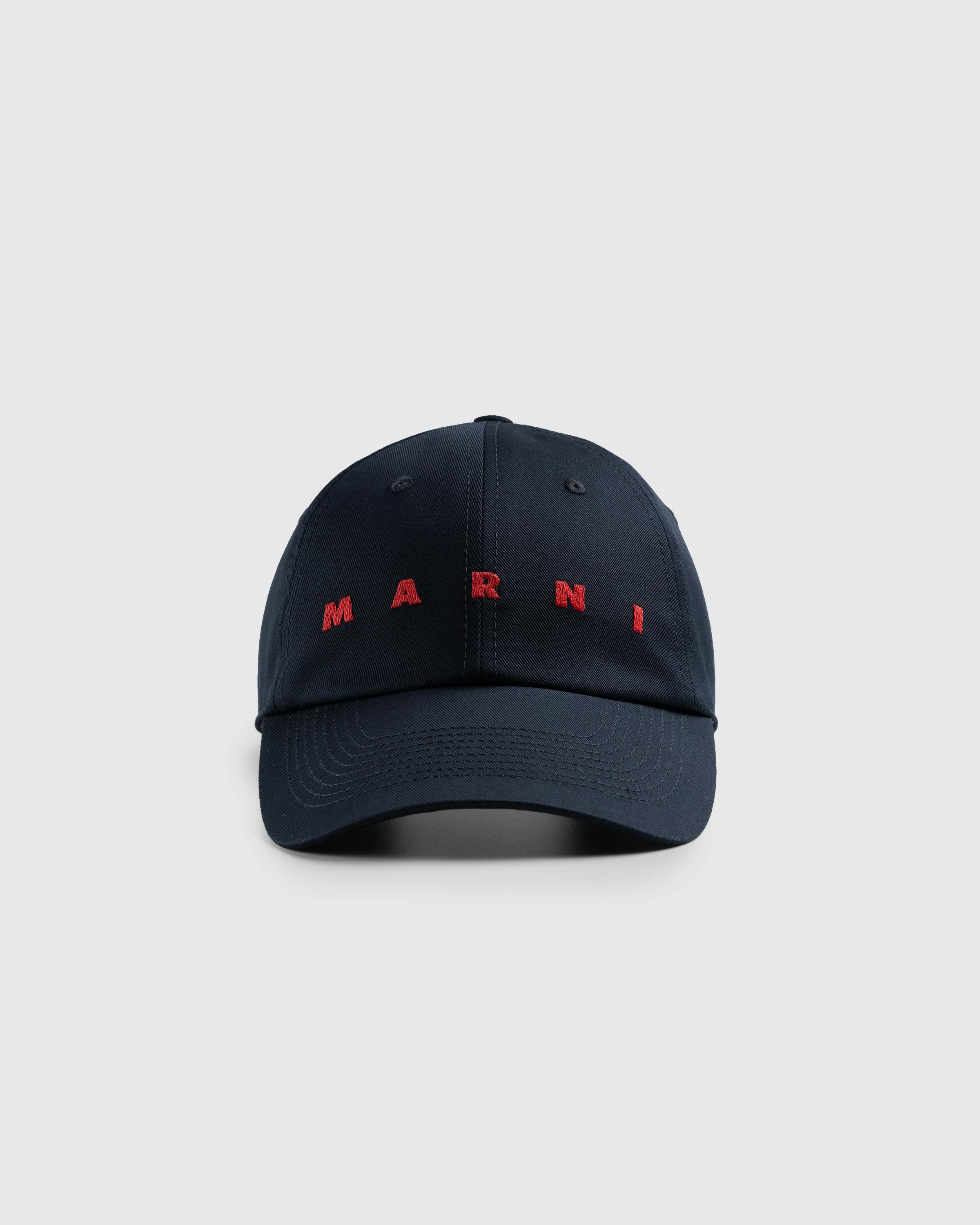 A staple Marni headwear style, the Baseball Cap is adorned with a brand logo that emerges on the front of the silhouette. The hat is woven from 100% organic cotton and detailed with traditional baseball cap design elements including a top button, embroidered eyelets for breathability, a curved brim, and an adjustable back strap.