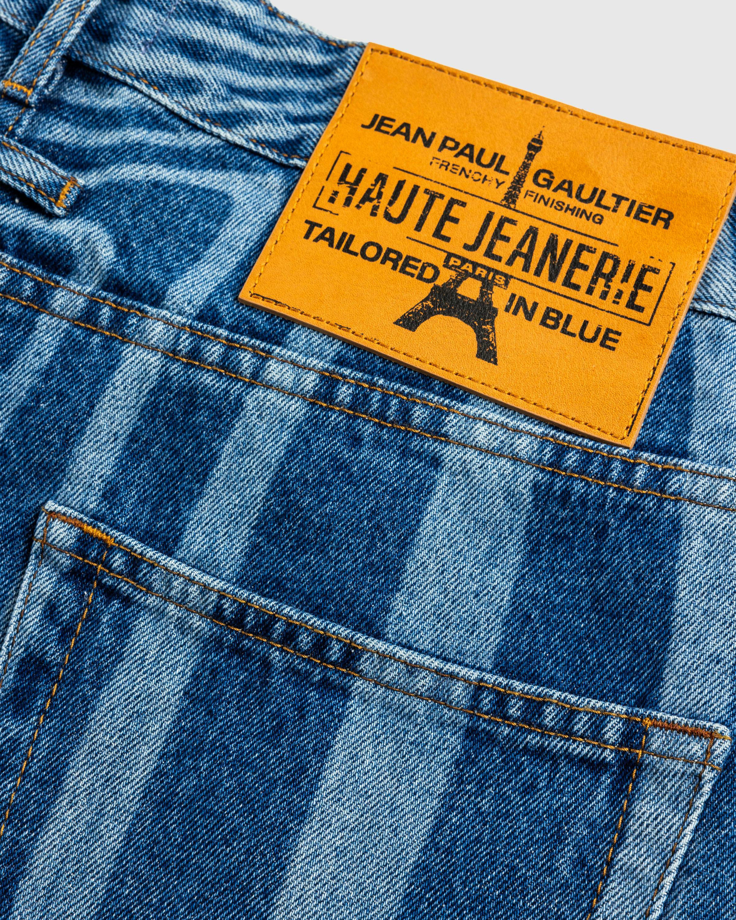 This standout pair of Jean Paul Gaultier denim is defined by laser-printed striped detailing. The pant is cut for a wide leg fit from 100% cotton and features traditional five-pocket styling. Details include button fastening and a zip fly, belt loops lining the waist, and a leather logo patch incorporated onto the back of the waist.