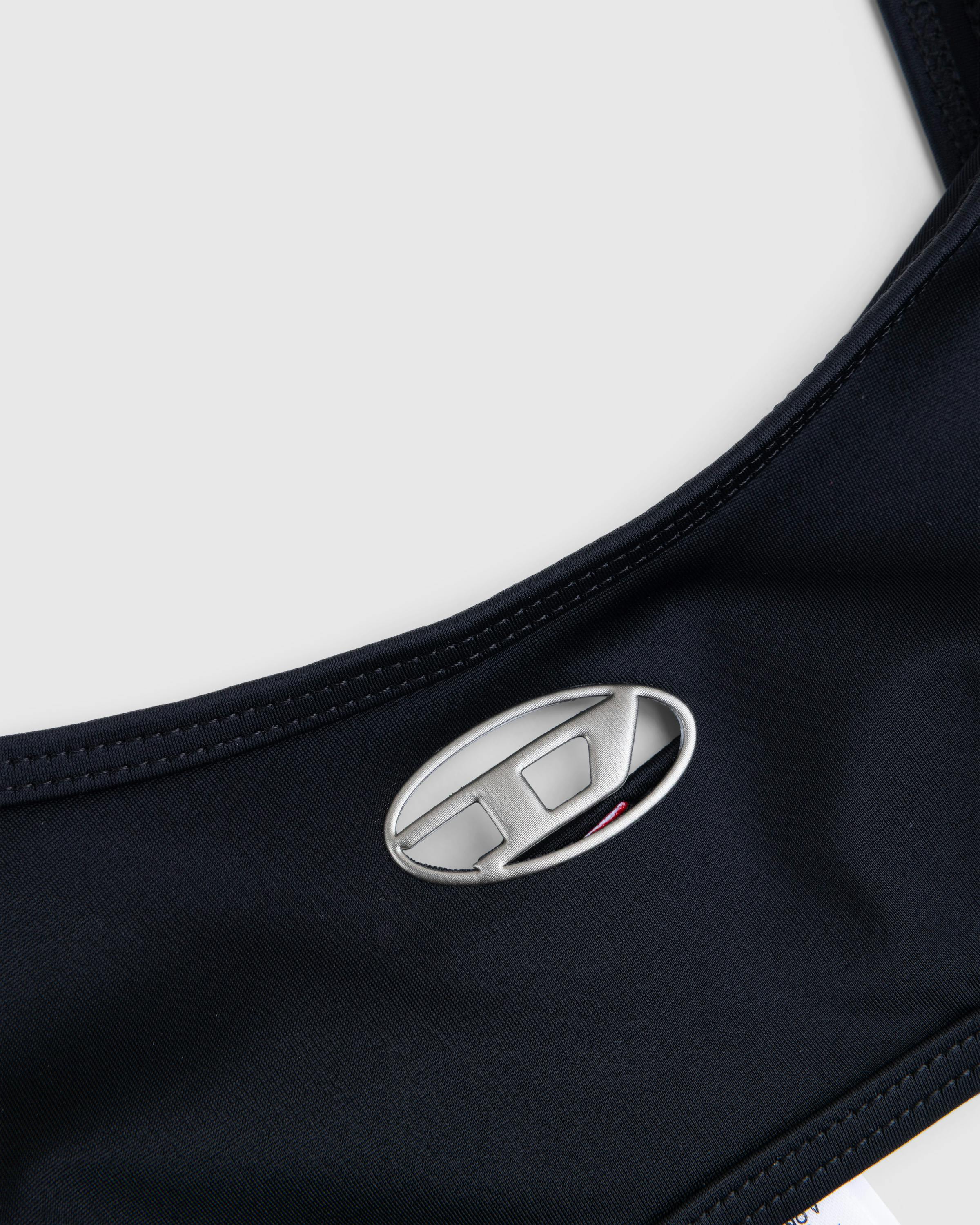This Diesel bikini top is crafted from a recycled stretch fabric in a sporty crop top silhouette. It features recycled stretch lining and fixed straps. The brand's iconic oval D logo is applied to the front of the piece for an authentic finishing touch.