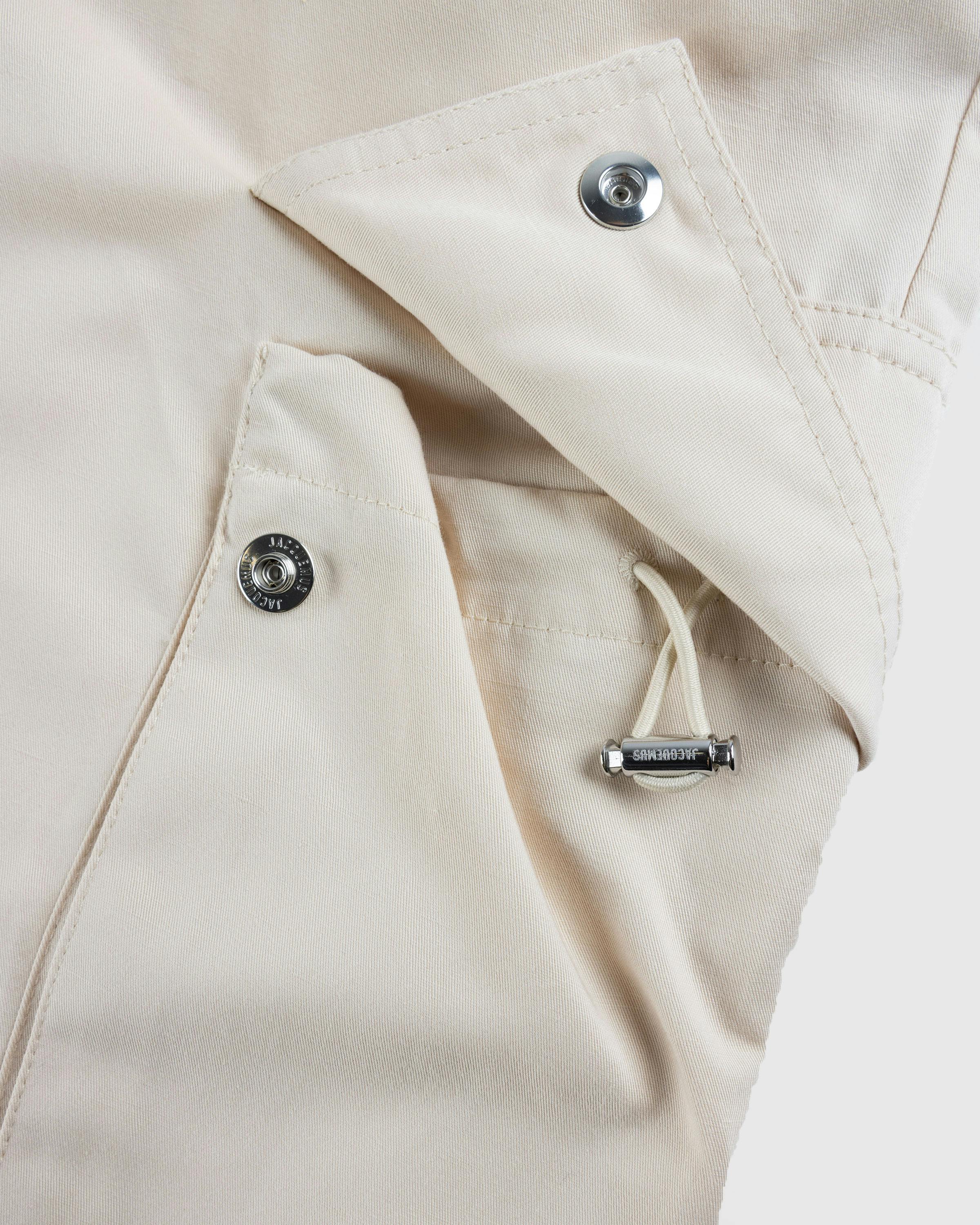 Le Cargo is a belted workwear pant by Jacquemus, produced in textured cotton linen with metal hardware. The pair is cut for a relaxed fit with a mid rise. It features an elastic hem, hidden zip fly, J belt loops, and a removable belt with an engraved metal buckle. Slant pockets are incorporated at the sides of the silhouette, while cargo pockets are applied to each leg.