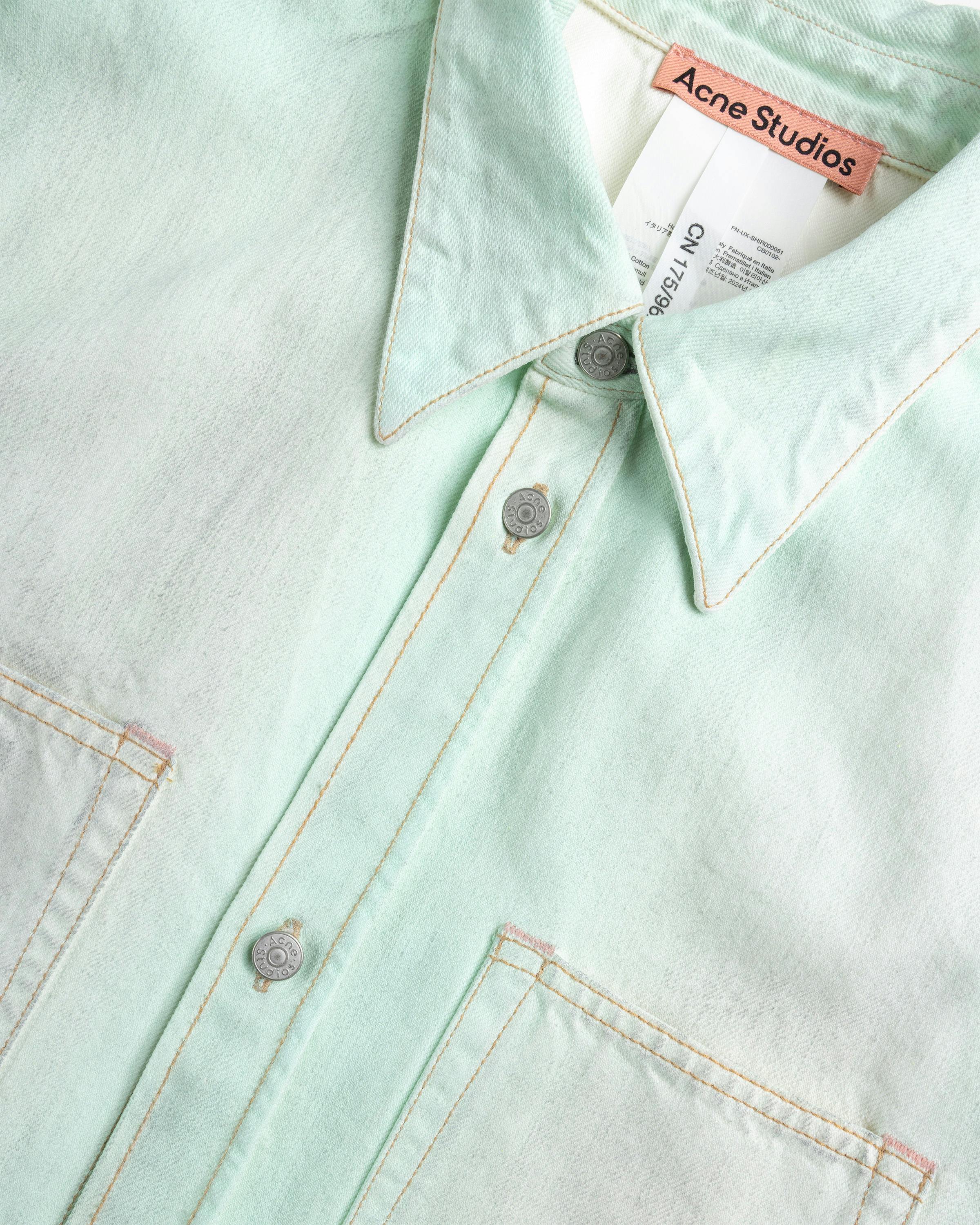 The Denim Button-Up is a relaxed-fitting style made from a non-stretch cotton denim fabric. It boasts a mint green wash for a light-colored look that features an allover painted finish that glows in the dark. Details include dropped shoulders, extra long sleeves, and two chest pockets.