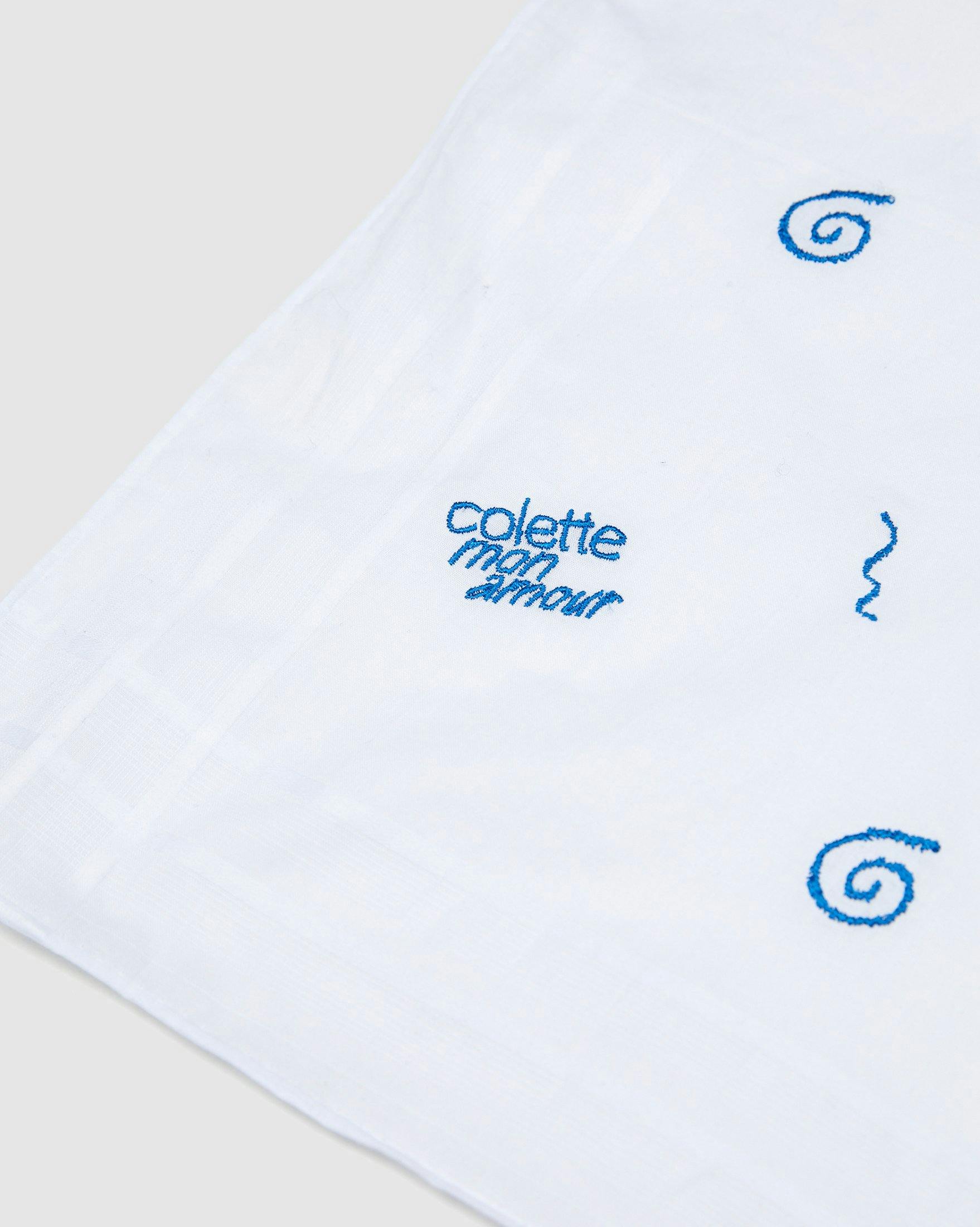 Nothing says subtle elegance like a pocket square. Thom Browne and Colette Mon Amour team up to embroider this cute pocket piece with Colette graphics in blue. Part of an exclusive and limited collaboration with the New York designer.