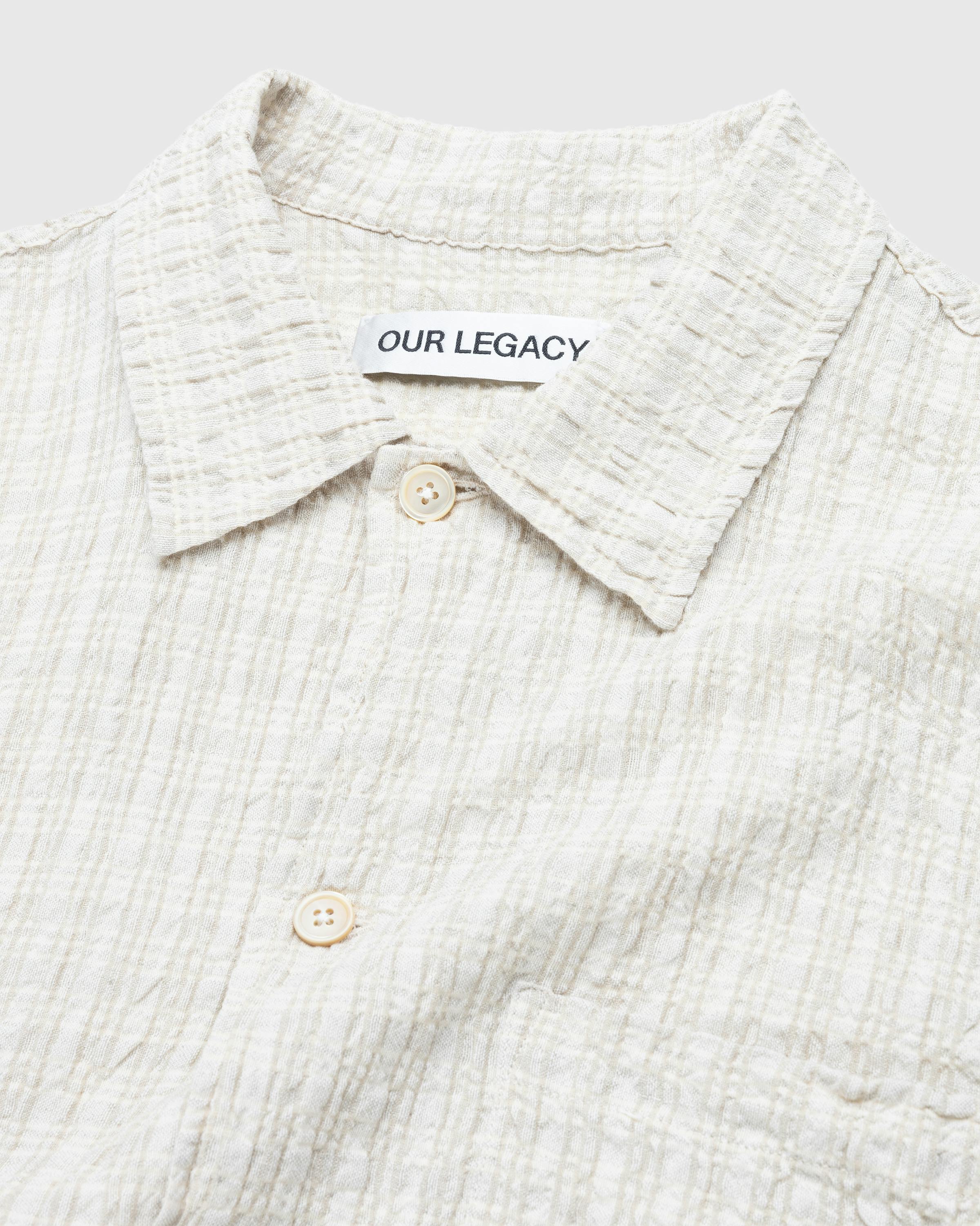 This new version of Our Legacy's Box Short-Sleeve Shirt is made using a fine and delicate Italian seersucker material that will shape to its wearer and naturally distress over time. The garment is cut for a classic boxy fit and features traditional design elements that include a point collar, front button closure with mother of pearl buttons, a straight hem, and single chest pocket.