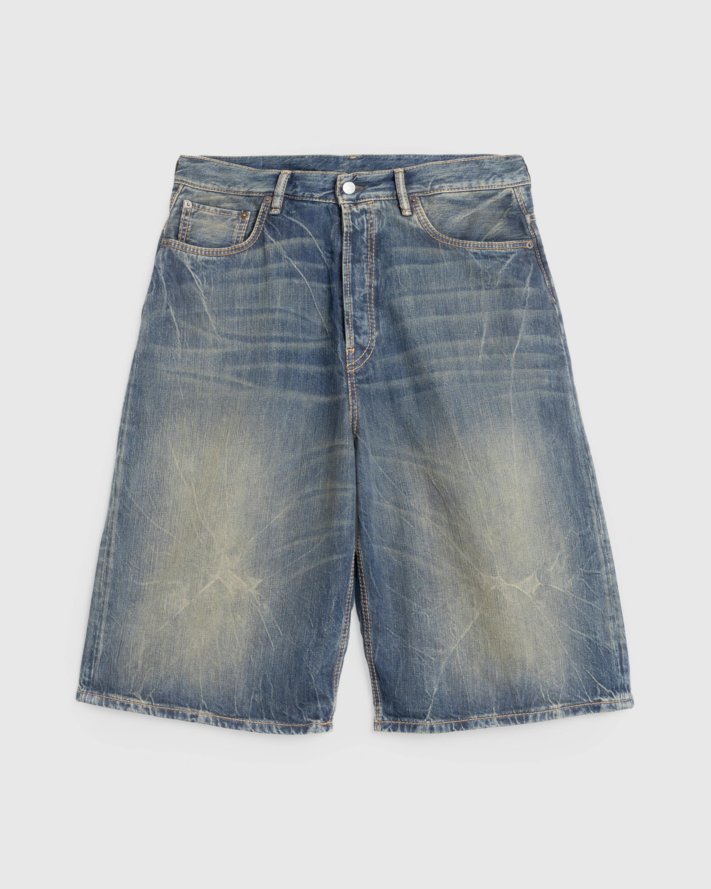 This pair of denim shorts is cut for a loose fit with a straight leg and a mid/low waist from 100% cotton. The style features a dark blue wash and traditional five-pocket construction, with button fastening and belt loops lining the waist. A leather logo patch is applied to the back of the waist to brand the garment.
