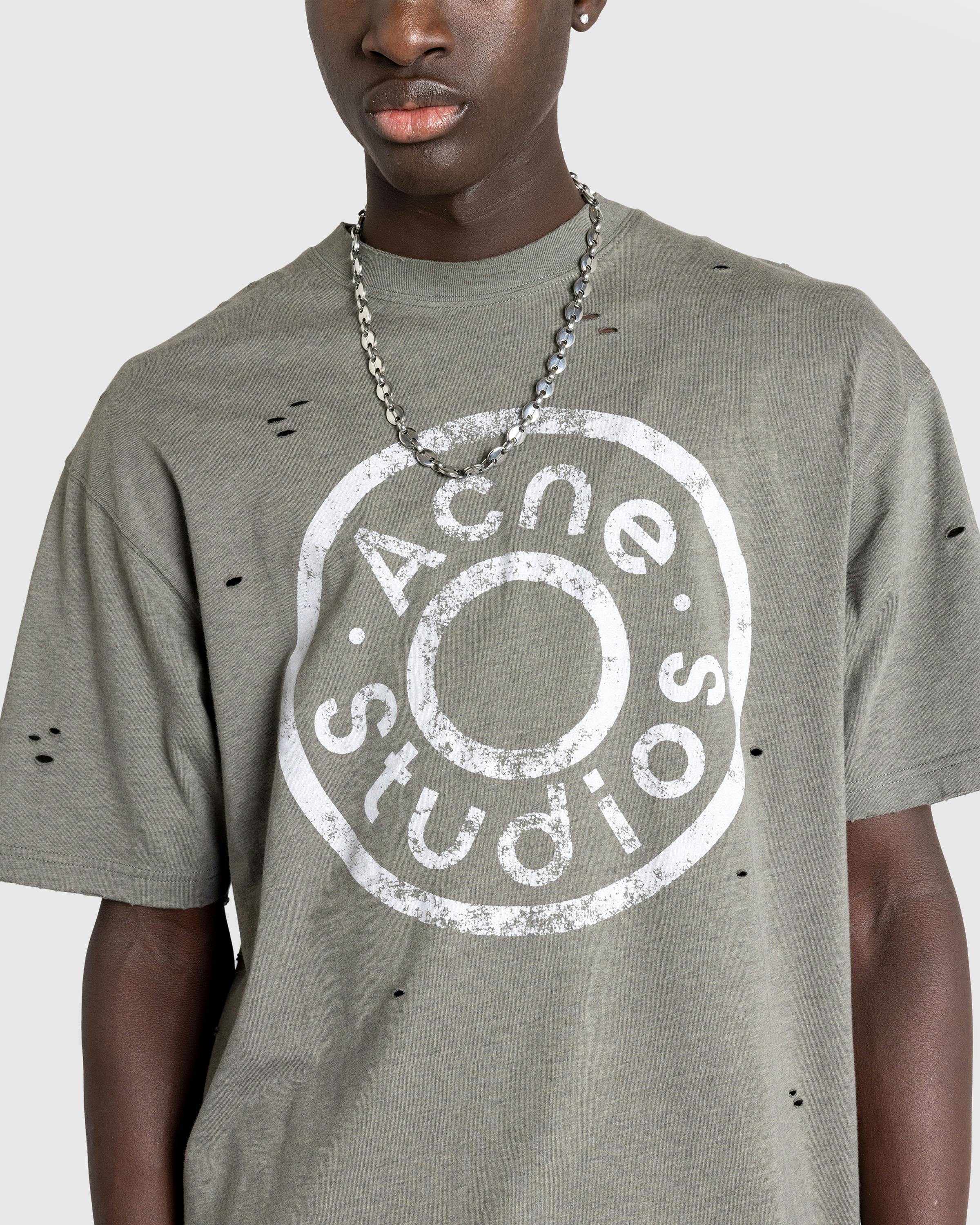 This Acne Studios t-shirt style is cut for a relaxed unisex fit from an organic cotton blend. It features distressed detailing throughout, as well as a seasonal button logo print. Additional design elements include a traditional rib knit crew neck, short sleeves, and a straight hem.