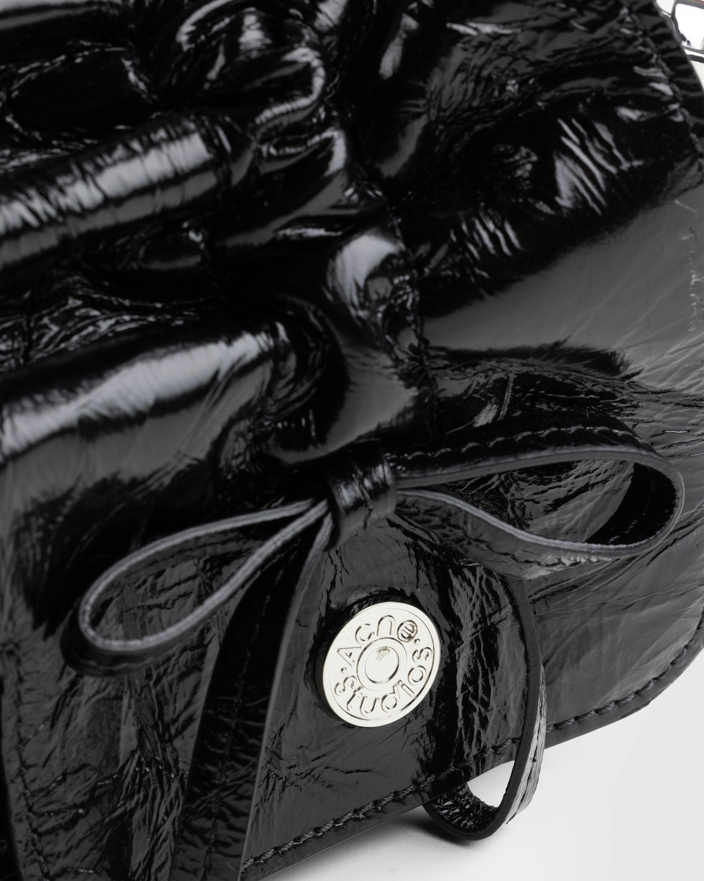 The Multi-Pocket Micro Bag is a compact baggage style made in Italy from shiny crinkled leather. It features a top handle and a long removable strap for various carry options, with multiple pockets that have discreet magnetic closure. Knot details are showcased on the front of the bag, which is finished with an Acne Studios logo charm.