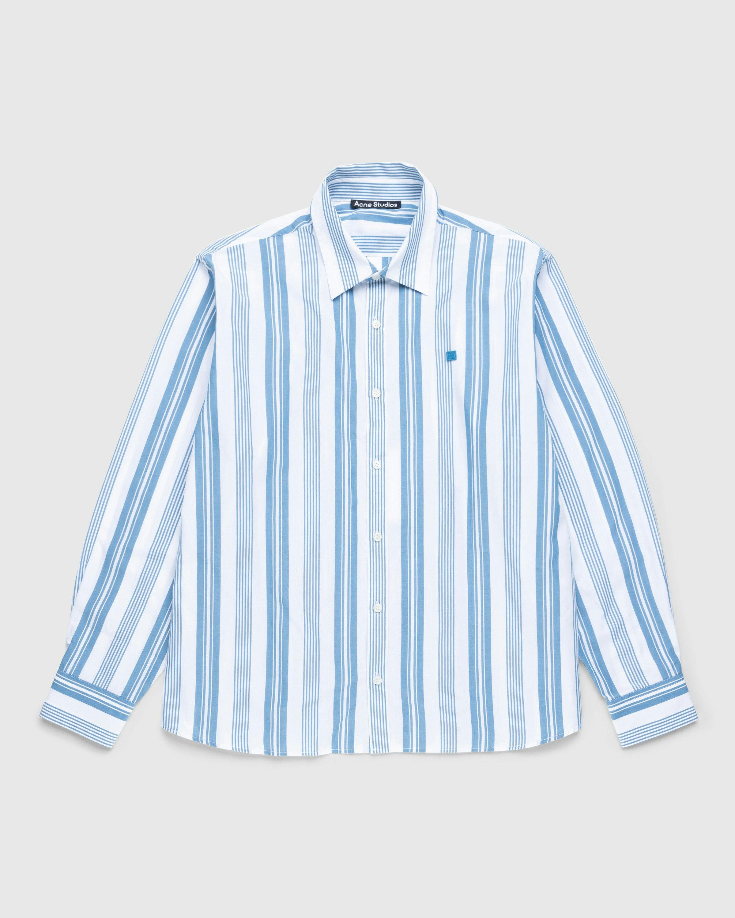 The Stripe Button-Up is a unisex Acne Studios style that is cut for a relaxed fit. Made from organically-grown cotton, the garment boasts an all-over stripe pattern, with a small face logo patch incorporated at the chest and complementary face logo embroidery on the back of the silhouette. Additional details include a pointed collar, front button closure, and button cuffs.