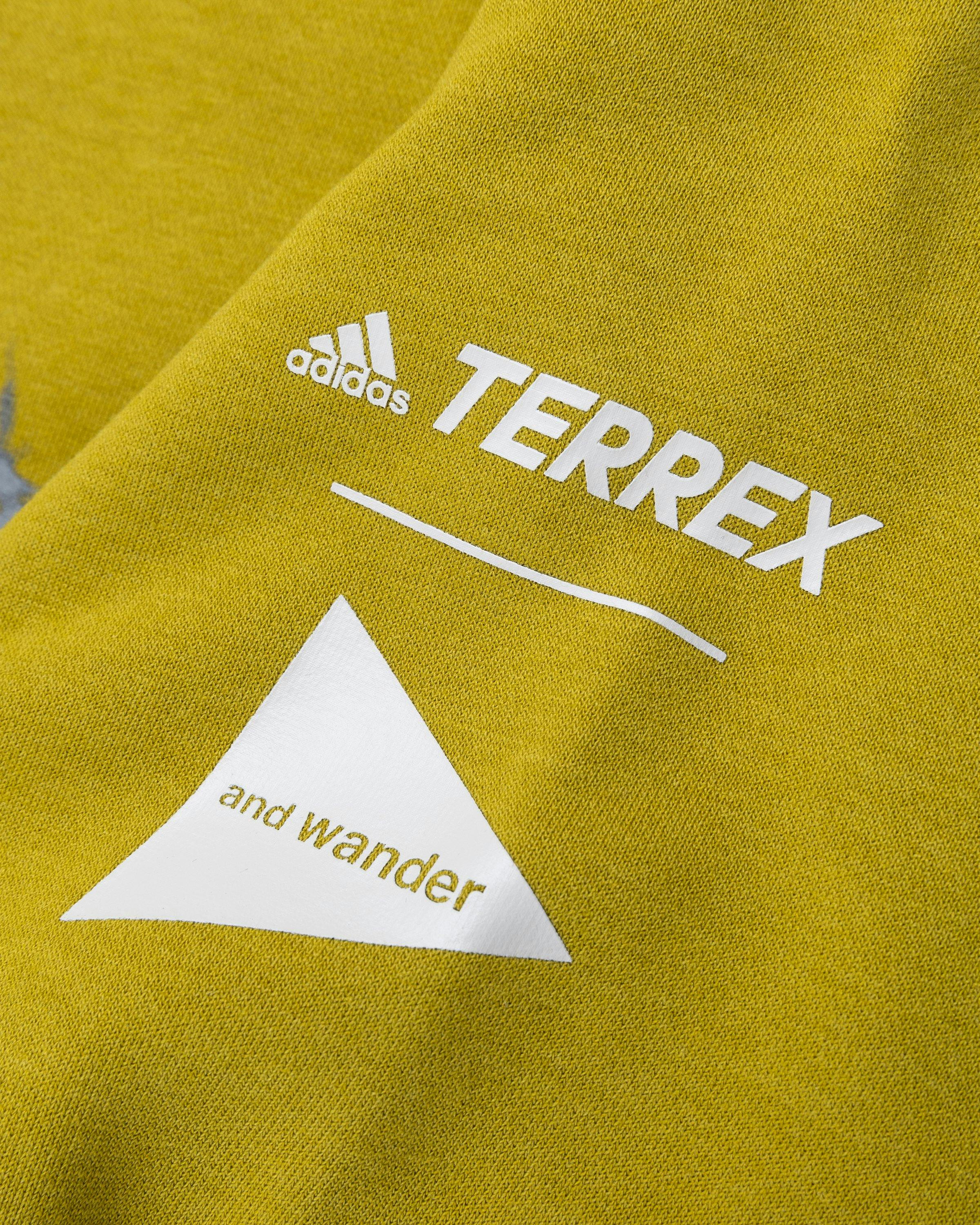 Like other pieces from the adidas TERREX x and wander collection, this hoodie is characterized by reflective detailing that not only adds stylistic flair but also increases visibility in low-light conditions. Cut in a loose fit for more comfortable wear, the cozy pullover is produced in polyester fleece and features a hood with adjustable cinch cords, front hand pockets, and ribbed trims. In addition to the reflective elements, the hoodie is embellished with graphic branding that ties the outdoor-inspired collaboration together, one that combines contemporary wearability with mountain-ready functionality.