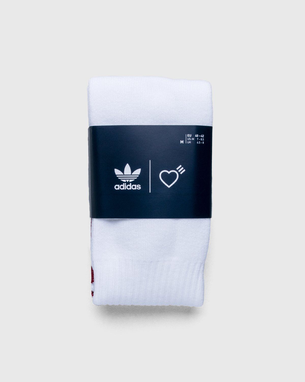 The white socks are marked with burgundy-colored Three Stripes around the top, while the collection’s "Gears for Futuristic Teenagers" wording is implemented inside the branding. Additional adidas and Human Made logos emerge to complete the design.
