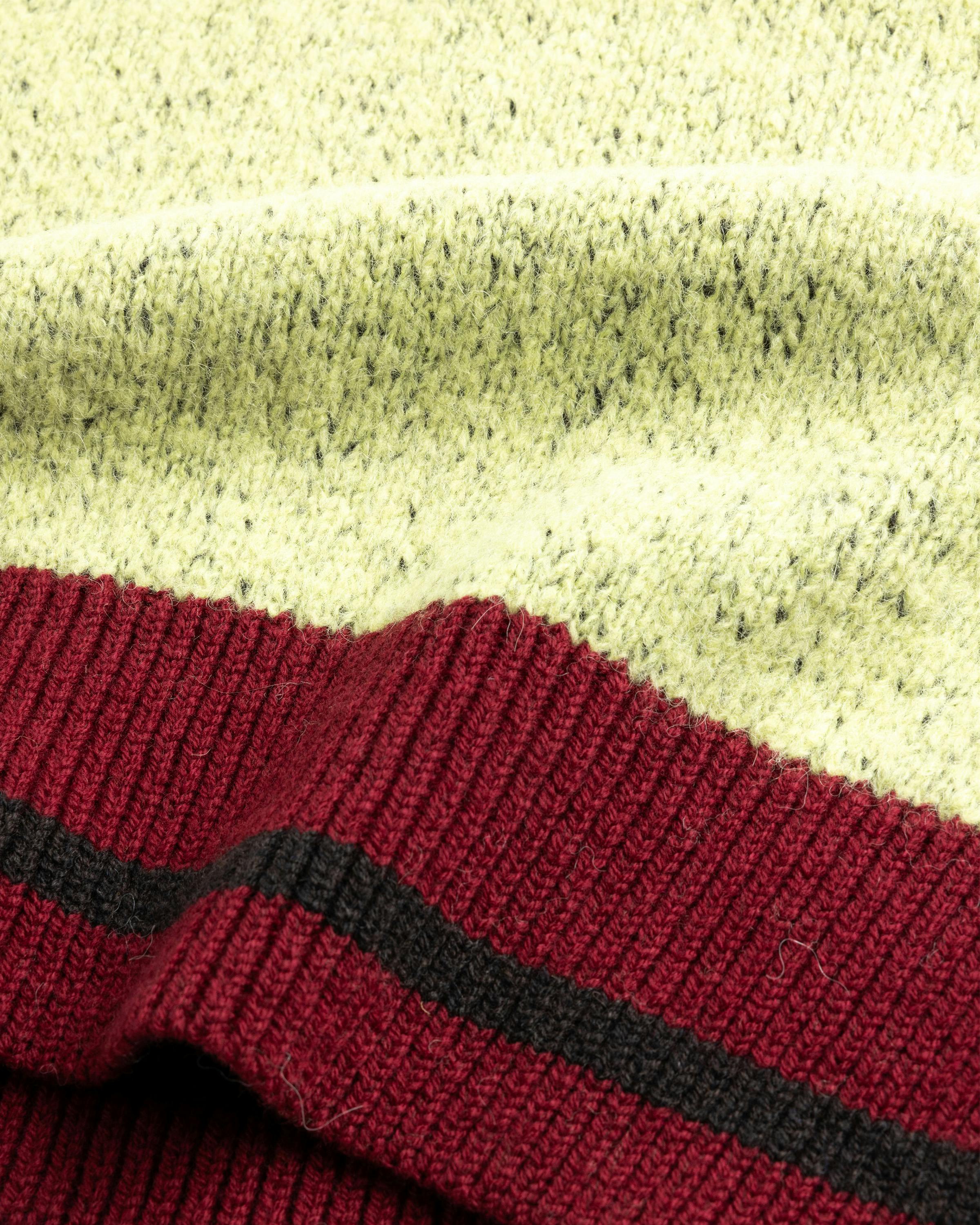 The Moon Sweater is a V-neck knit style produced in a soft lambswool and alpaca blend fabric. It is cut for a standard, unisex fit and features contrasting rib knit trims with striped detailing at the V neckline, cuffs, and hem.