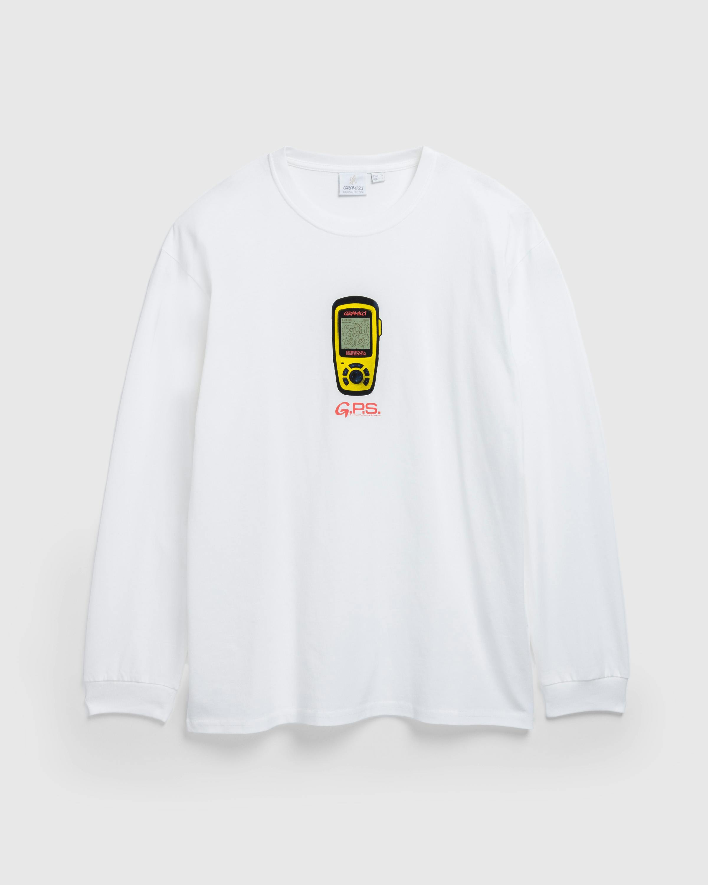 The GPS Tee is a seasonal graphic style produced in a midweight organic cotton jersey. It is unisex and cut for a classic boxy fit. Traditional design elements include a rib knit crew neck and cuffs, long sleeves, and a straight hem.