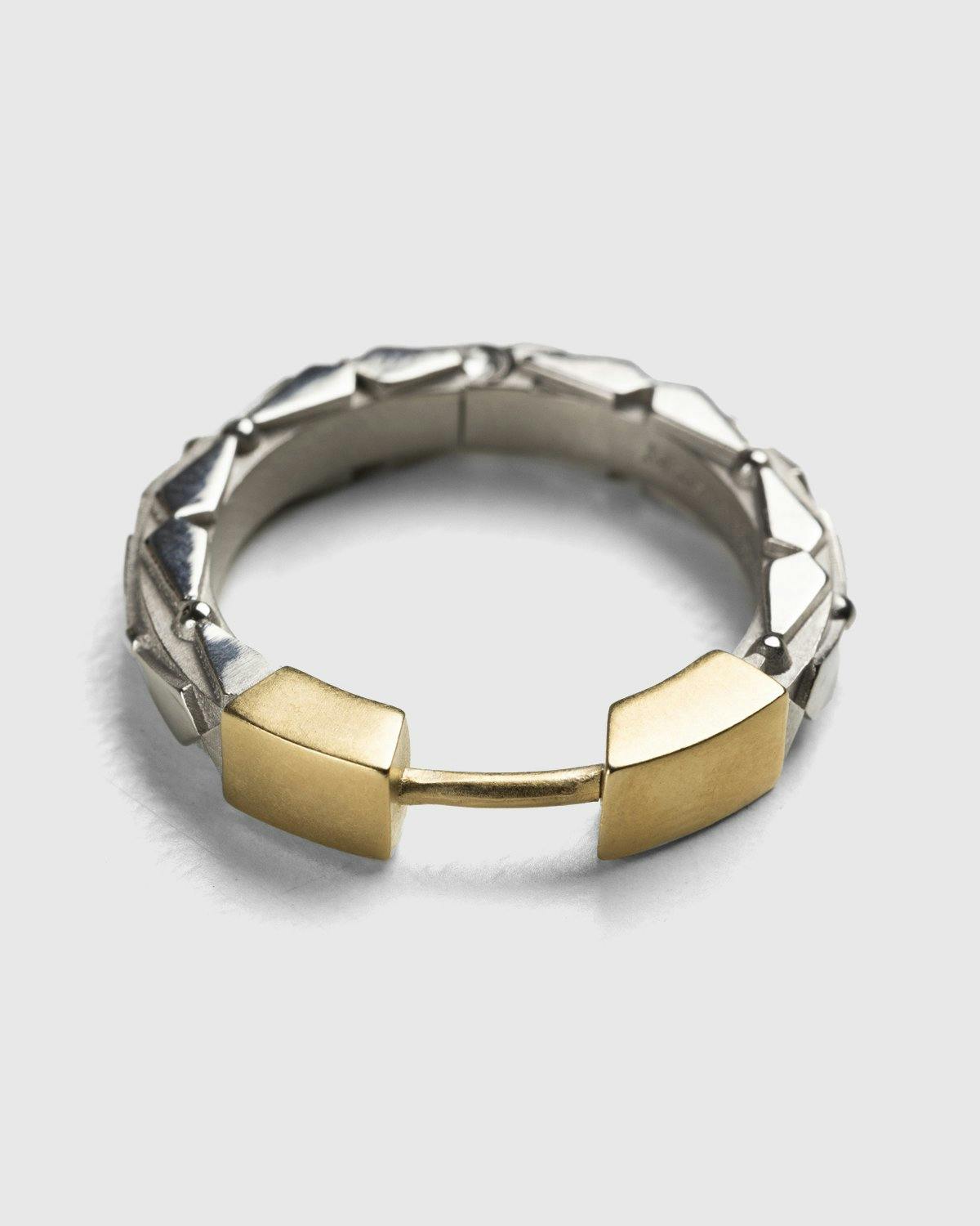 Silver and gold tones merge together on this luxe hoop earring from Maison Margiela. The jewelry showcases a distinctive sculpted design and features hinge pin fastening. The perfect complementary piece for any outfit, you virtually never have to take this designer creation off as it is one of those versatile jewelry items you can wear day in and day out. It comes as a single earring, so you’ll have to snag two if you’re looking to complete the set.