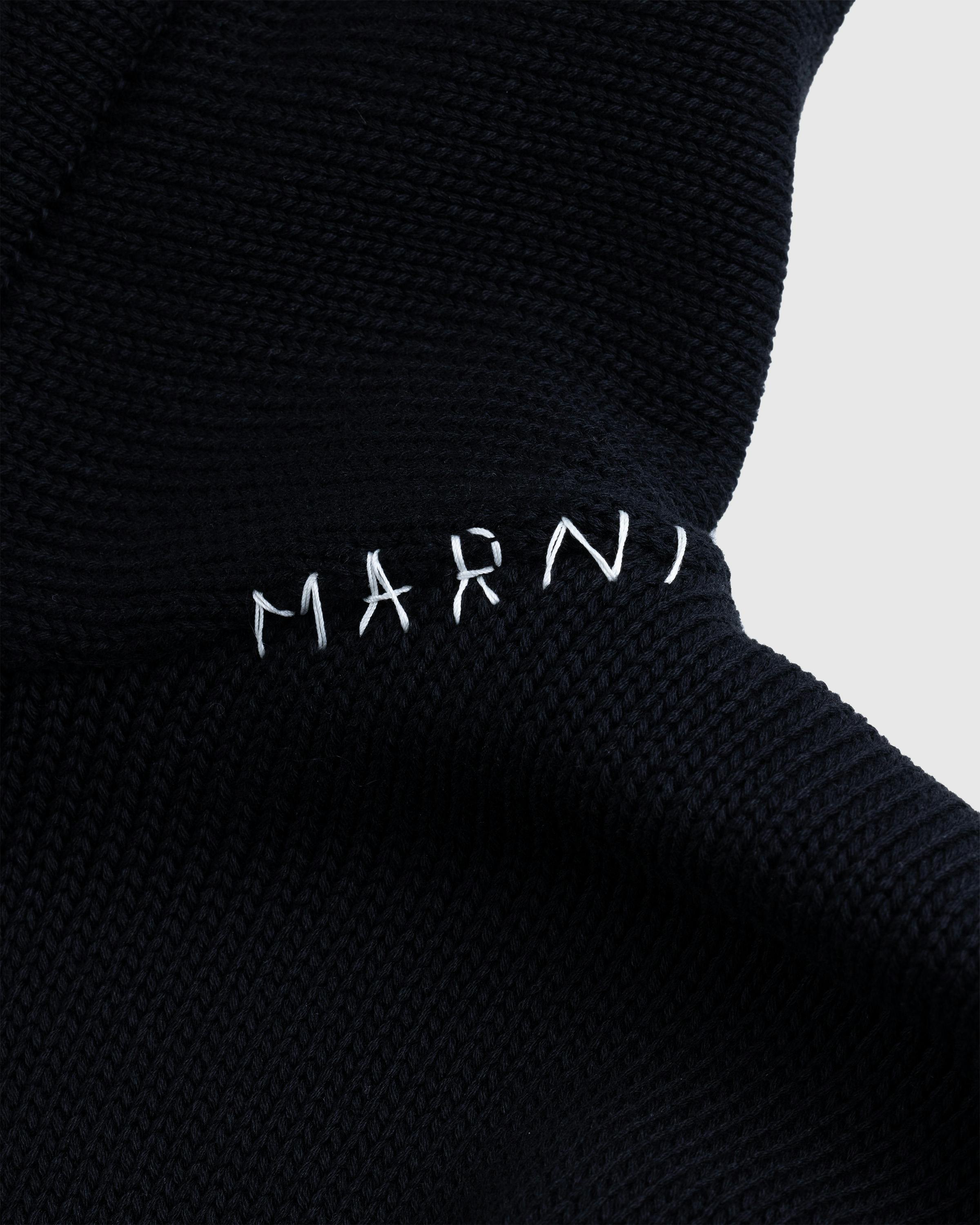 This cozy Marni garment is knit from a midweight cotton fabric. It features distressed trim for a pre-worn look. An adjustable drawstring hood provides protection, while a contrasting logo brands the piece at the shoulder.