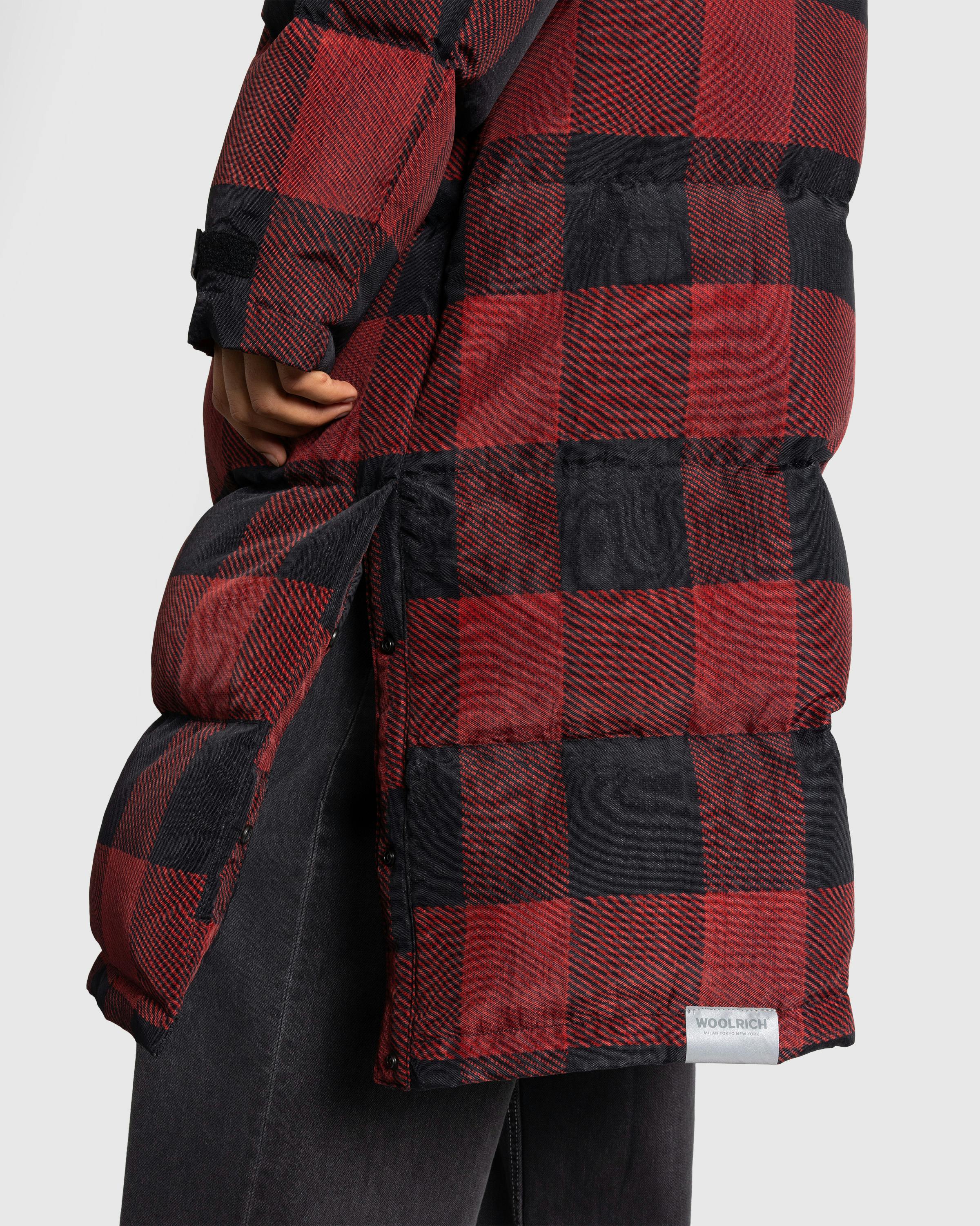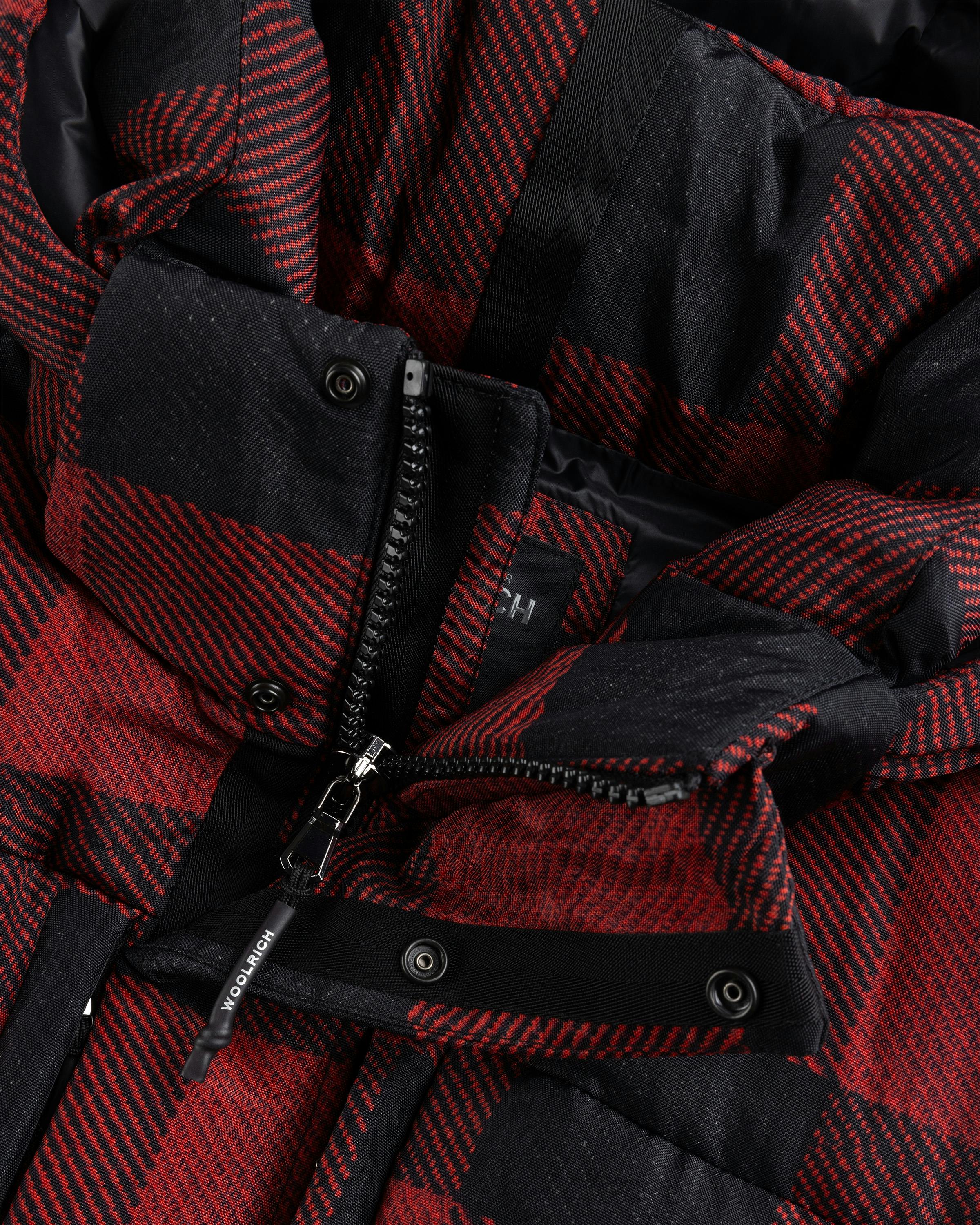 Per the name, the Buffalo Check Long Parka is defined by an all-over buffalo check pattern executed in a classic black and red color combination. The cozy garment is crafted from 100% nylon on the outer, with duck down and feather padding for added warmth and comfort. An adjustable drawcord hood helps offer further protection, while a side snap opening enhances airflow. The front is fit with concealed zip and snap button fastening, in addition to two zippered pockets and two slanting hand pockets.