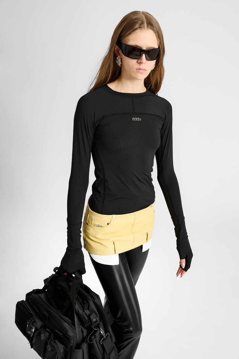 But the shapes are surprising: there's the inimitable volume one expects from 032c wearables but also snug, form-fitting performance gear and slinky eveningwear. Two forms of velvet — one delicate and sheer, the other scarred by paint — epitomizes the dichotomy.