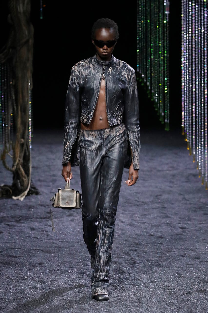 Models meandered through hanging crystal foliage and winding tree trunks set to soft, ambient music from avant-garde electronic composer Sarahsson, clad in woolen coats, slip dresses, and leather sets all of which arrived lovingly pre-distressed, so much so in some cases that they were hanging by a thread, literally.