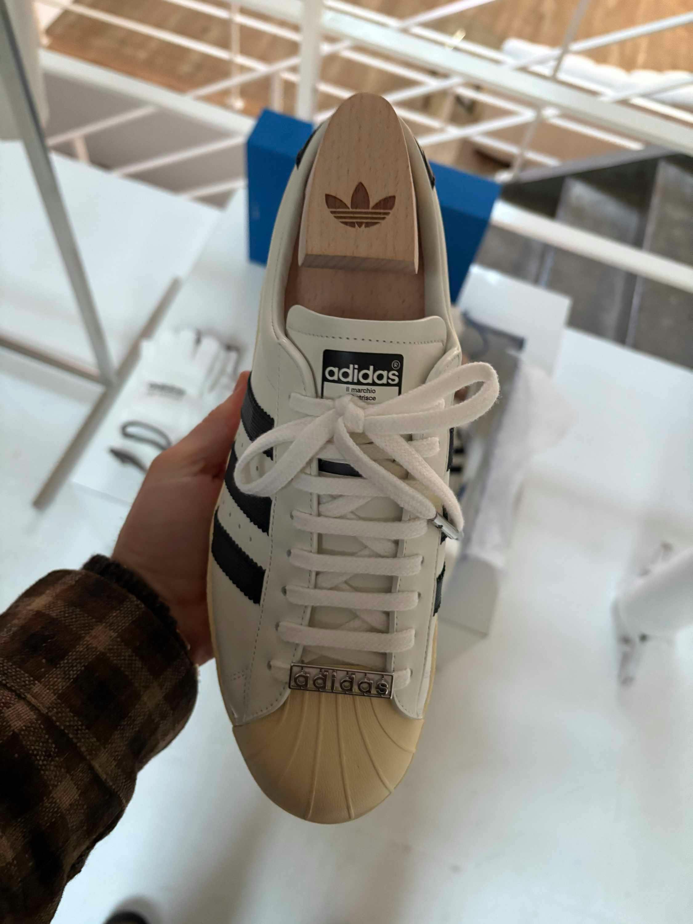 We're talking the OG adidas Firebird tracksuit shaped by hand of the "finest leathers," trim athletic-ish T-shirts cut from cashmere, and Superstars cobbled in Italy — with real silver lace tips and cashmere laces! — that come packaged with wooden shoe trees and white gloves for delicate handling. Retail on those shoes? $800.