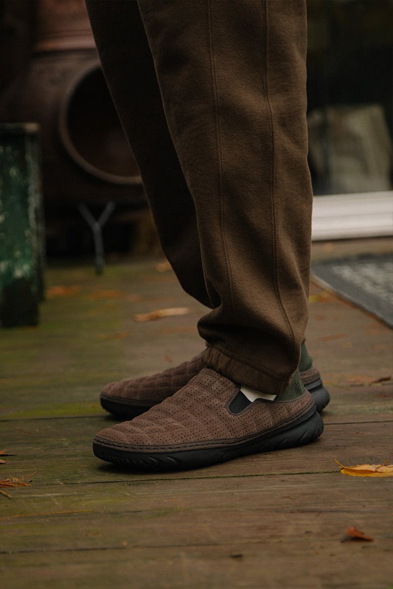 The ultralight slip-on featured a dark brown perforated suede upper and collapsible heel section, creating adaptability – these can be worn as a slipper or shoe, making it the perfect indoor-to-outdoor transitional piece of footwear.