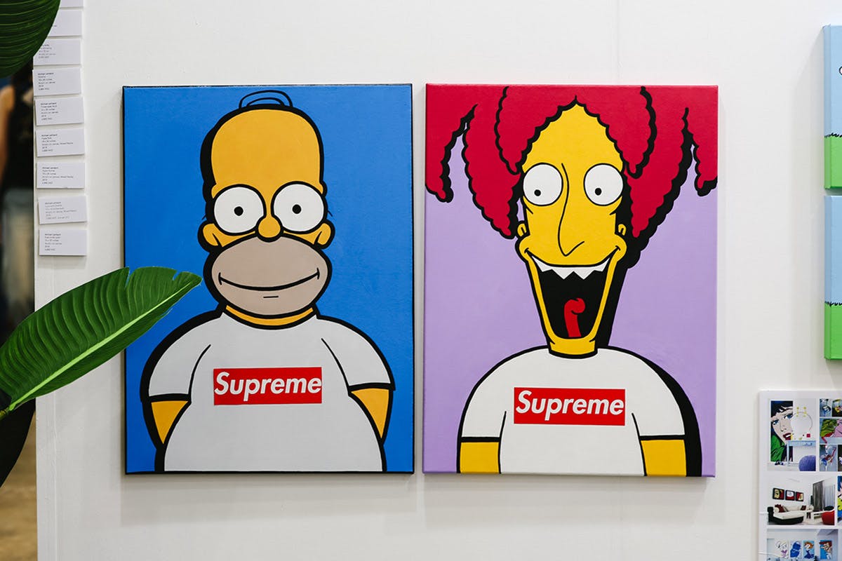 A key piece for all Supreme- and Simpsons-heads was a painting featuring Homer Simpson and Sideshow Bob wearing box logo tees. Also among the works were references to Andy Warhol’s Campbell’s Soup Cans and Roy Lichtenstein’s comic-book stylings, as well as Mickey Mouse, Pikachu, and Astro Boy.