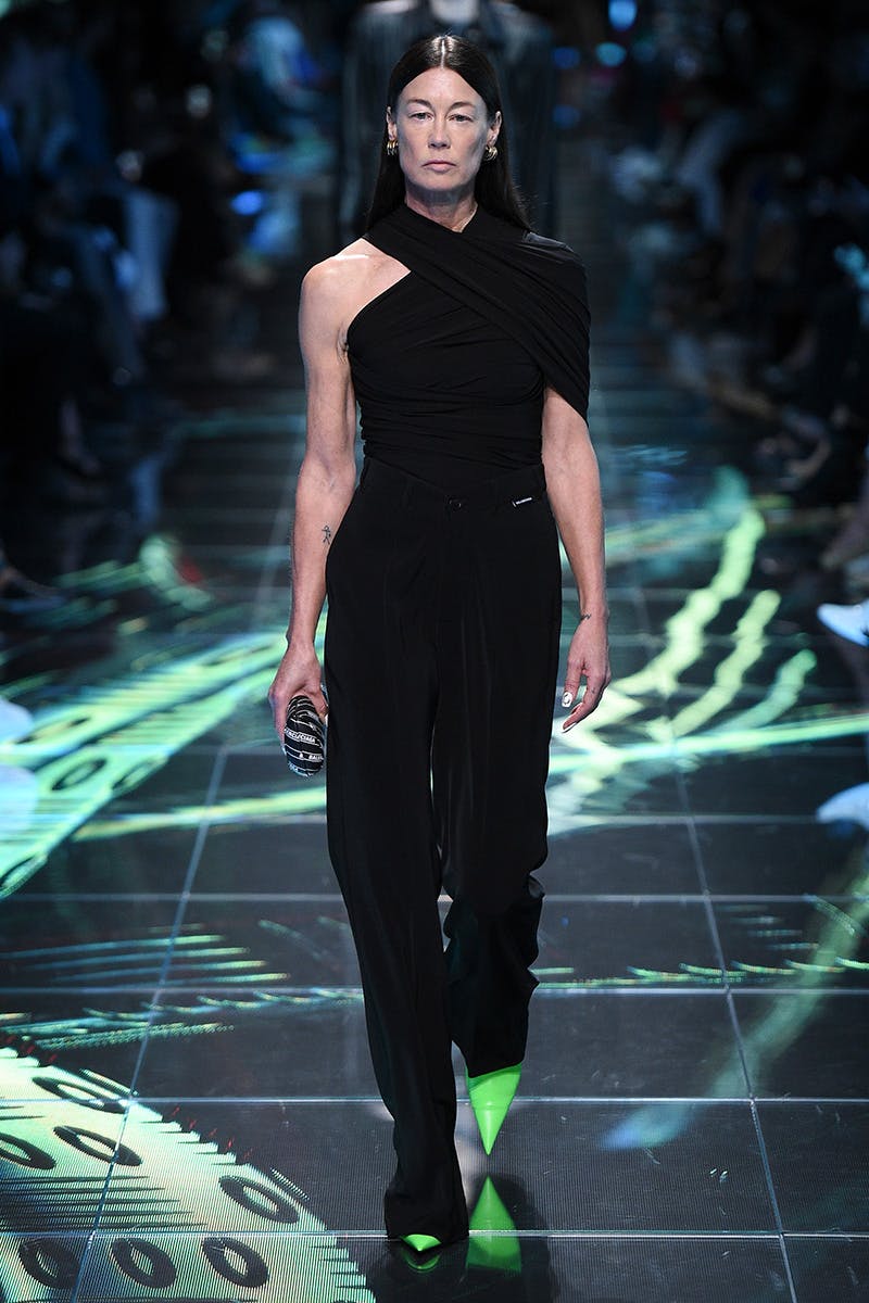 For SS20, Demna Gvasalia created a “faux Balenciaga parliament or assembly” to backdrop a show which explored the shifting codes of power dressing. Models stomped down an EU-blue carpet dressed in off-kilter variations of classic, tailored suits and boxy overcoats. So far, so Balenciaga. But the show’s most surprising element lay in its casting of several older models, described by Vogue as “senior delegates.” Tellingly, this diverse line-up was largely street-cast: from cleaners and architects to engineers and gymnasts, the vast majority of Demna’s delegates had no agency representation.