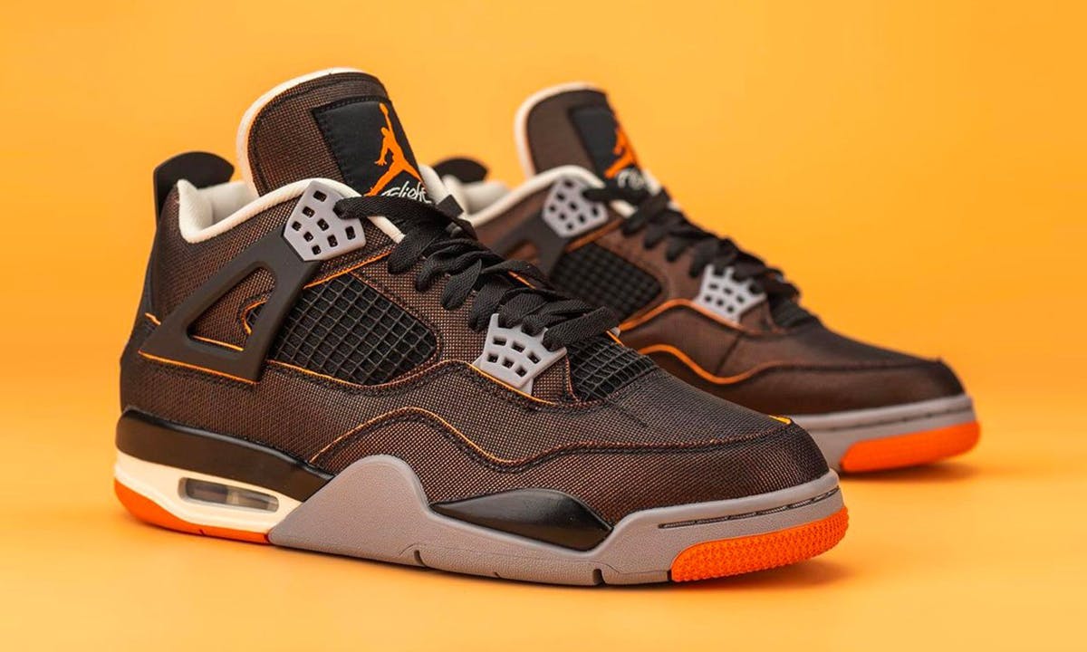 The Air Jordan 4 "Starfish" falls in line with the recent deconstructed trend — à la Virgil Abloh — with its intriguing mesh-like upper that blends shades of orange and black. Gray coloration is implemented via the wing eyelets and midsole, while Jumpman branding appears in orange and gray on the tongue and heel, respectively. To round out the design, "AIR JORDAN" is found upside down on the inside of the exposed foam tongue.
