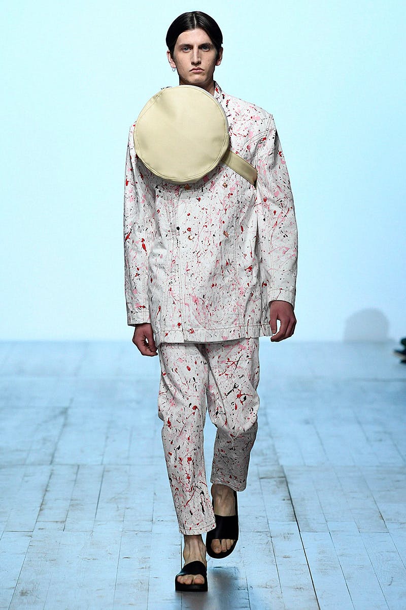 However, some of the most memorable SS19 looks come from Mullins' lighthearted spin on classic tailoring: blue and white suits with all-over flecked paint prints, the koi carp-print suit, and cream long-sleeve shirts with cut-outs under the arms. Again, Mullins has designed these key pieces to be removable and easily reworked. "The shirts can be worn many ways by reattaching the sleeves or the collar in different positions, which is really fun to play with," he says.