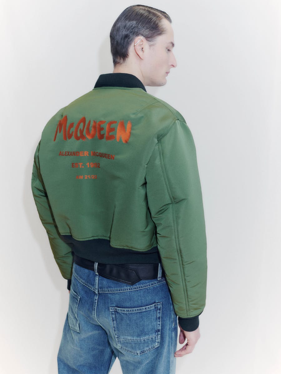 Mirroring some items from the accompanying womenswear line, these casual looks pair "MCQUEEN"-branded flight jackets and washed-out denim jeans in a Travis Bickle manner, though the latter fabric is also utilized for a jumpsuit and the blazer/trucker/bomber oddities. They made for odd bedfellows for the collection's other items, which leaned harder into tailoring territory by way of double-breasted blazers, hidden placket overcoats, and trim two-pleat trousers.