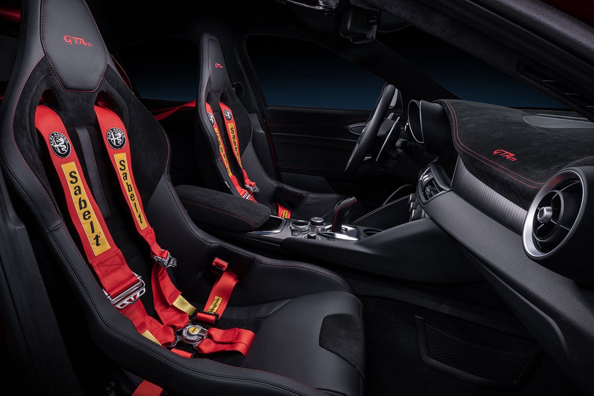 Building upon the GTA, the Giulia Quadrifoglio GTAm has a power-to-weight ratio of 6.2 pounds per horsepower, which Alfa Romeo says is the best in its class. Weighing in at 3,350 pounds, this particular version travels from 0 to 60 miles per hour in 3.6 seconds. Inside, the street-legal GTAm is outfitted with carbon-backed front bucket seats with six-point harnesses and a harness bar attached to a structural roll hoop in the rear.