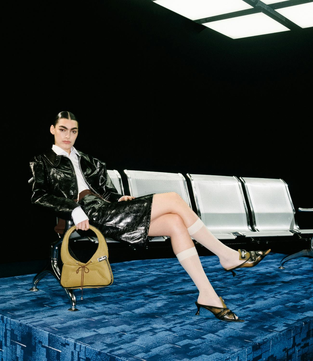 In alignment with Sarca’s dedication to sustainability, the rest of the footwear is imbued with eco-friendly practices. Statement knee-high boots, for example, feature deadstock leathers and faux furs, while surplus fabrics from past seasons are transformed into ankle boots with wing details, ankle-strap kitten heels, and slouchy boots with striking airbrush effects.