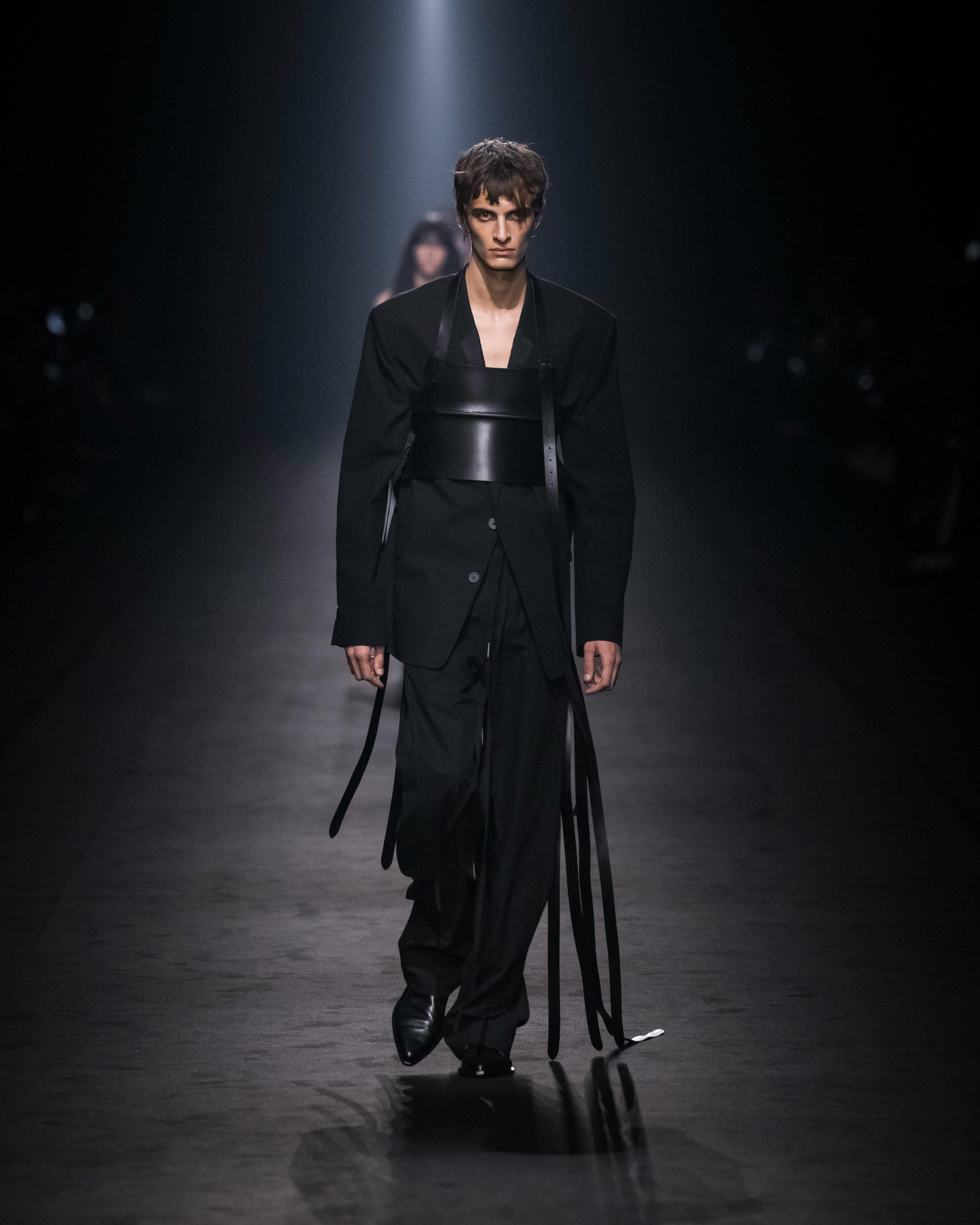 Oh, the places belts went for Ann Demeulemeester SS24, where the accessory designed to hold up our pants materialized as arm cuffs and, yes, regular belts (except buckles to the side for Ann Demeulemeester). Oh, and let's not forget those secured around models' abdomens in a stack of five.