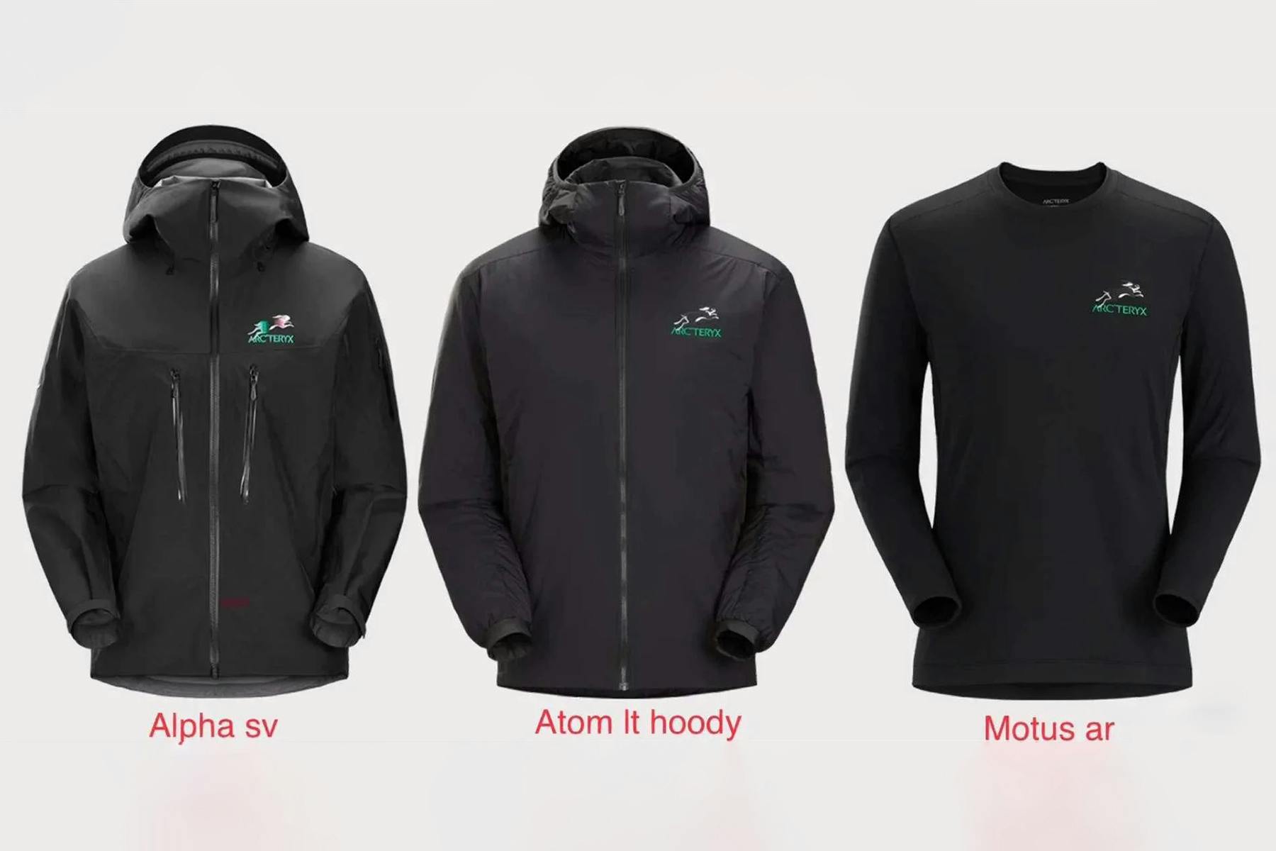 The sneak peeks hinted at what the official campaigns revealed: a few classic Arc'teryx items — Alpha SV Jacket, Atom LT Hoody, Motus AR shirt — branded with a stylized water rabbit logo designed by Lam on the front and rear.