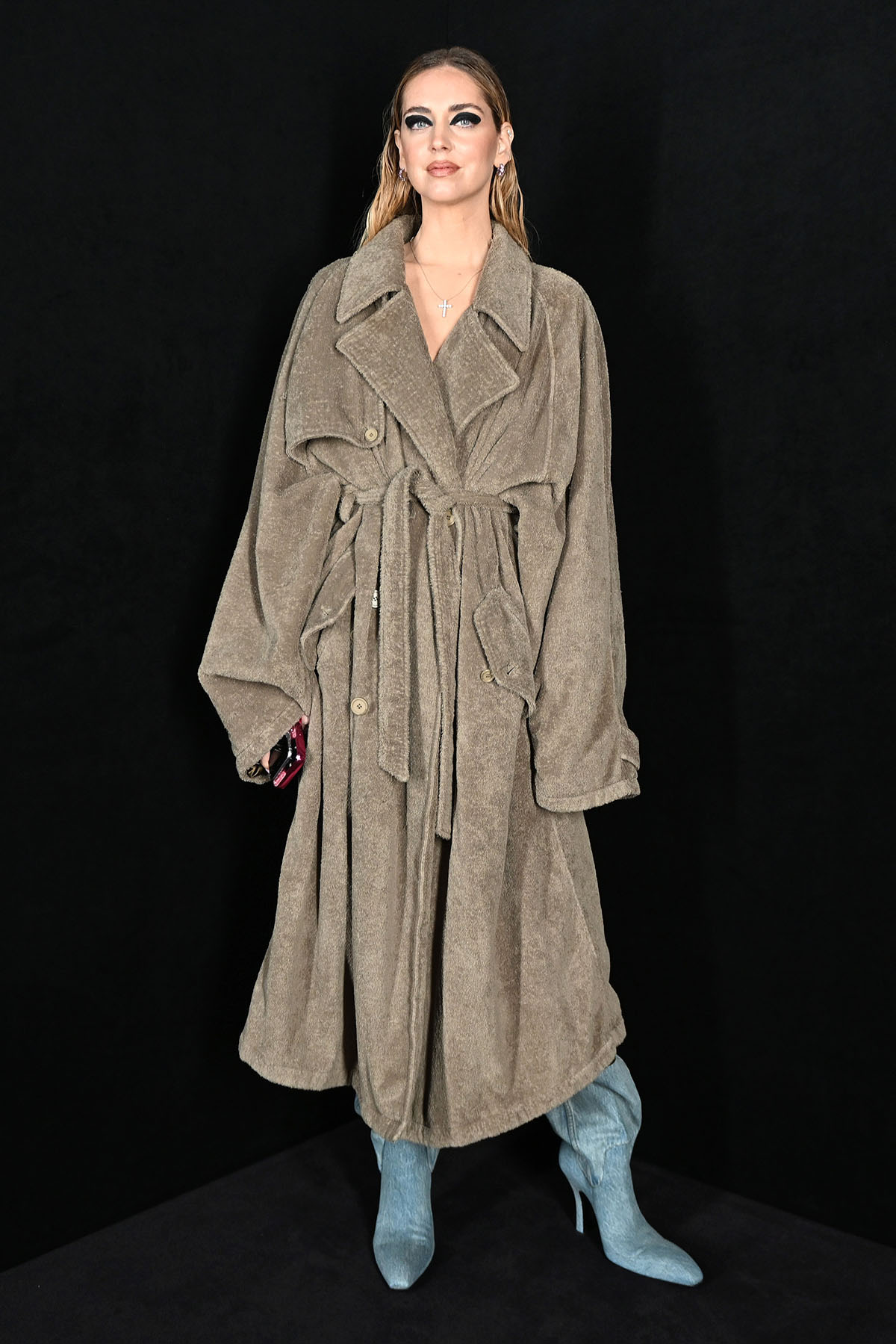 And Chiara Ferragni, fashion blogging's First Lady, gave bathrobe couture in some sort of terrycloth trench coat paired with equally baggy denim boots. A poor man's Julia Fox raccoon eye finished off the lackluster look.