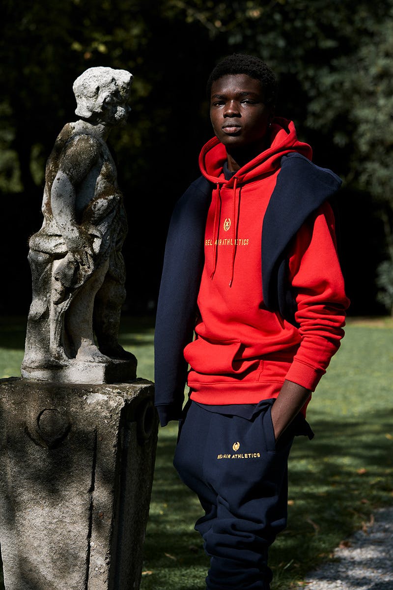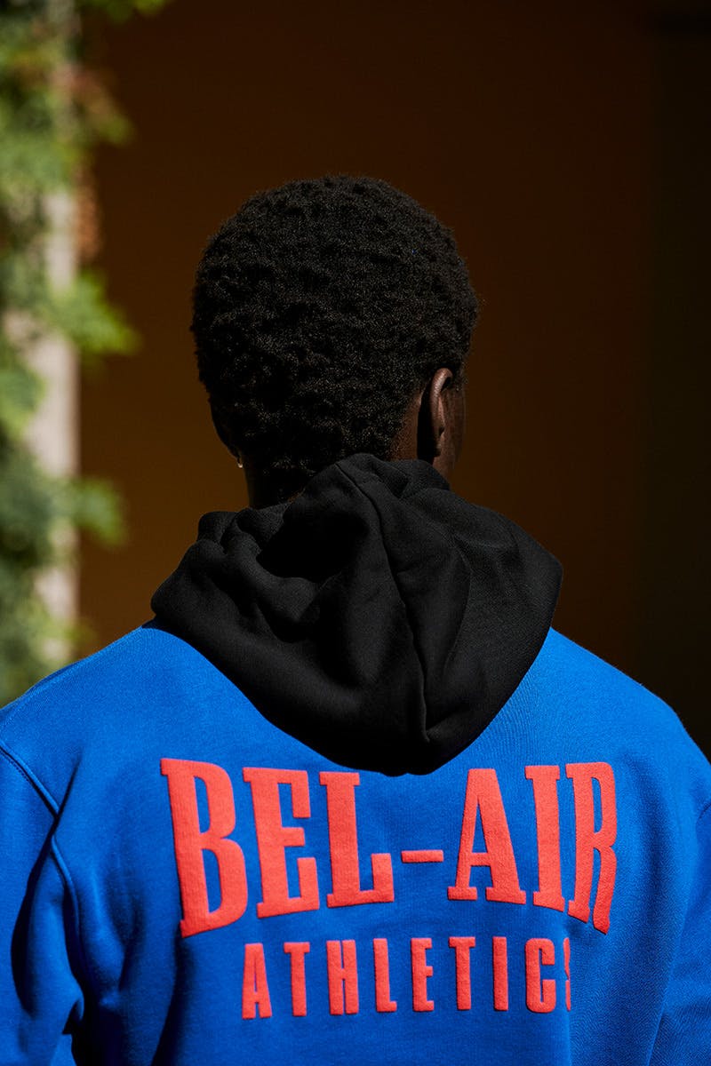 Ahead of that, a smaller capsule of unisex basics including track jersey shorts, hoodies, and tees featuring Bel Air Athletics branding and the wreathed crest logo are now available online.