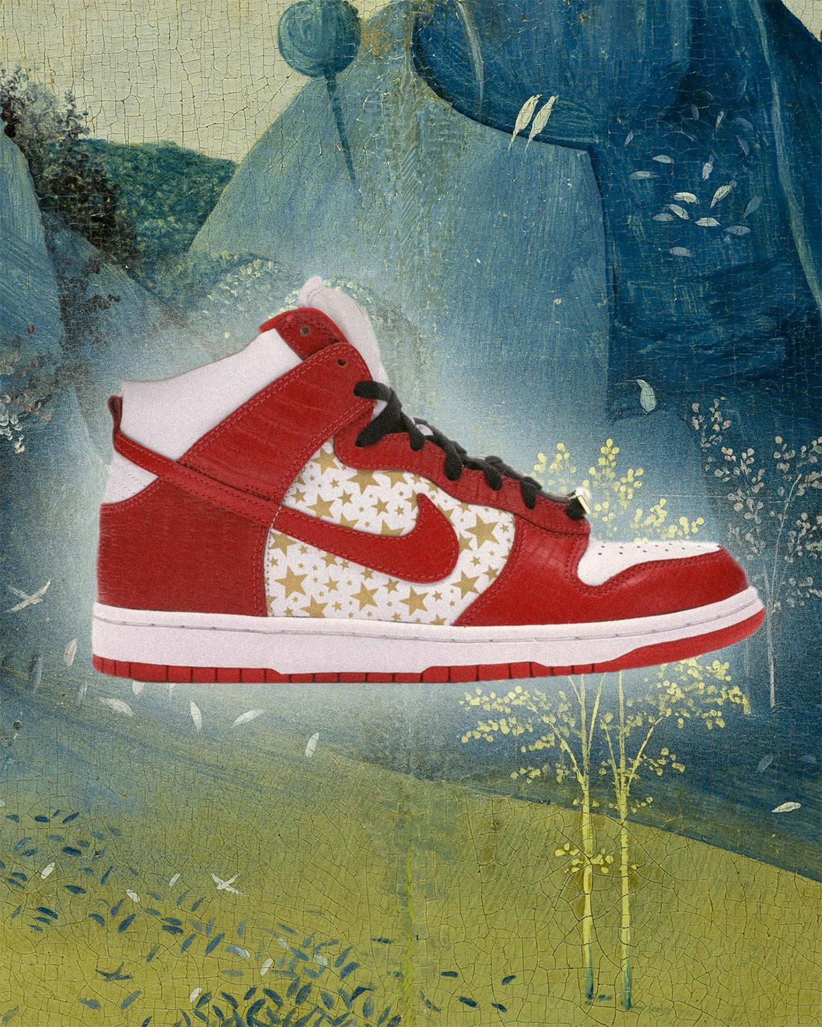 Significance: Arriving in three colorways, this Dunk High was originally intended to have a Nike logo repeat pattern, though that was ditched in favor of stars when the sneaker was eventually released.