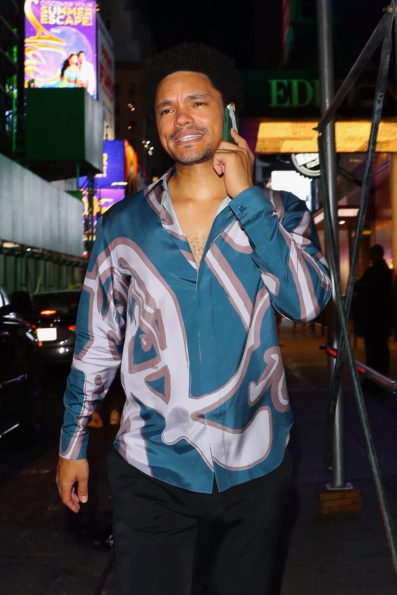 Blouse unbuttoned with a few manly chest hairs peaking out, Trevor Noah let loose at Beyoncé's album release party in a tasteful far-out print shirt.