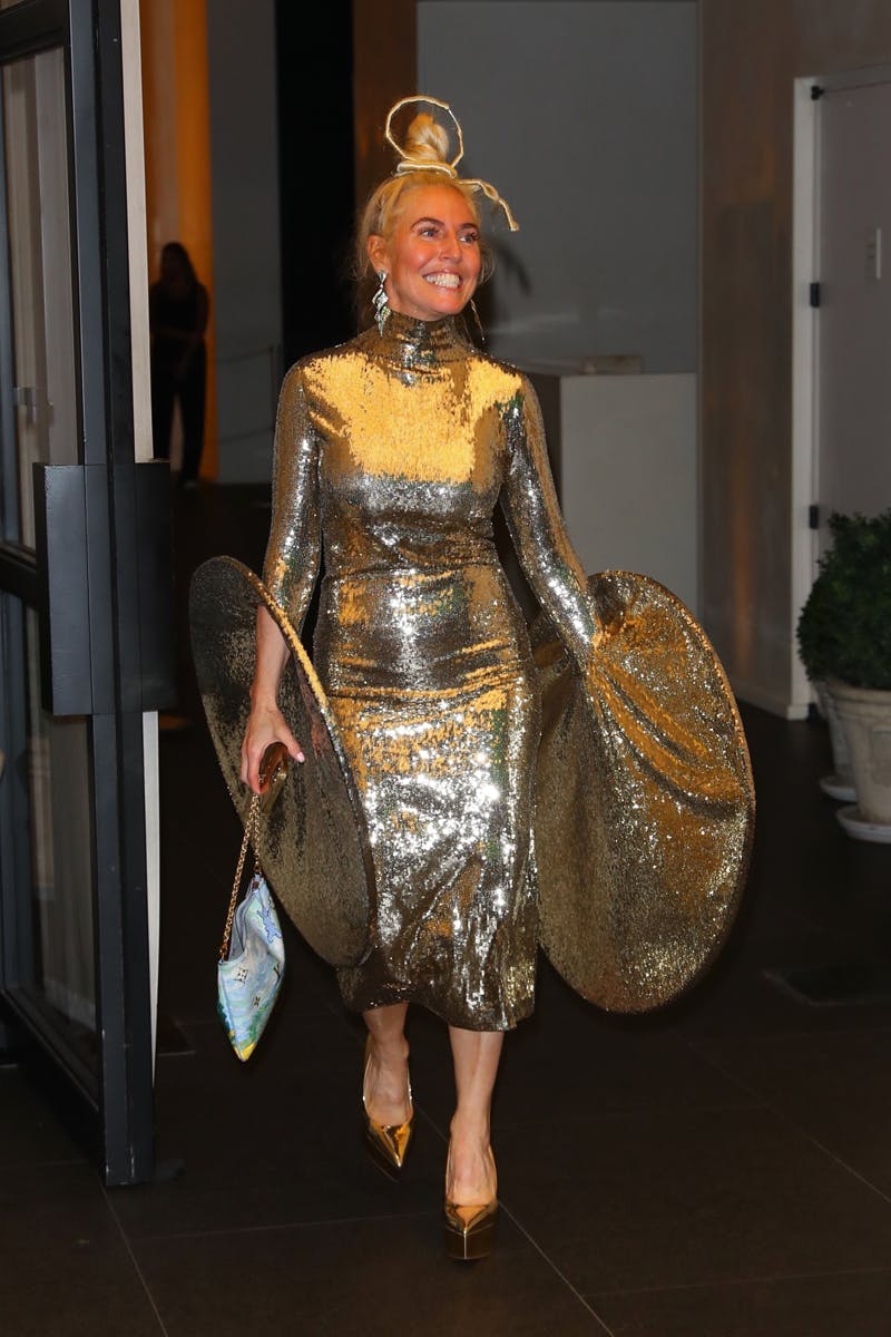Bey's stylist Marni Senofonte channeled big disco energy (literally) with her gold sequin XXXL-flared sleeved dress and gilded pumps.