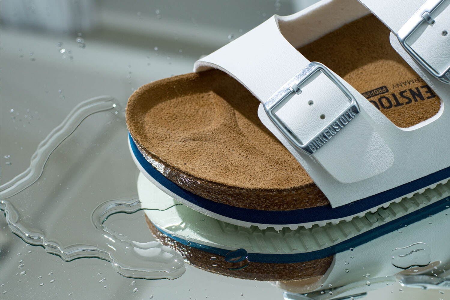 See that blue stripe above the Birkenstock's white outsole? It signifies Birkenstock's Professional line, a series of sandals launched in 1980 that was designed for people who're otherwise on their feet all day, like nurses and chefs.