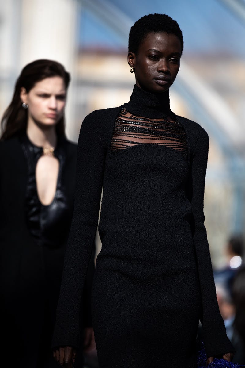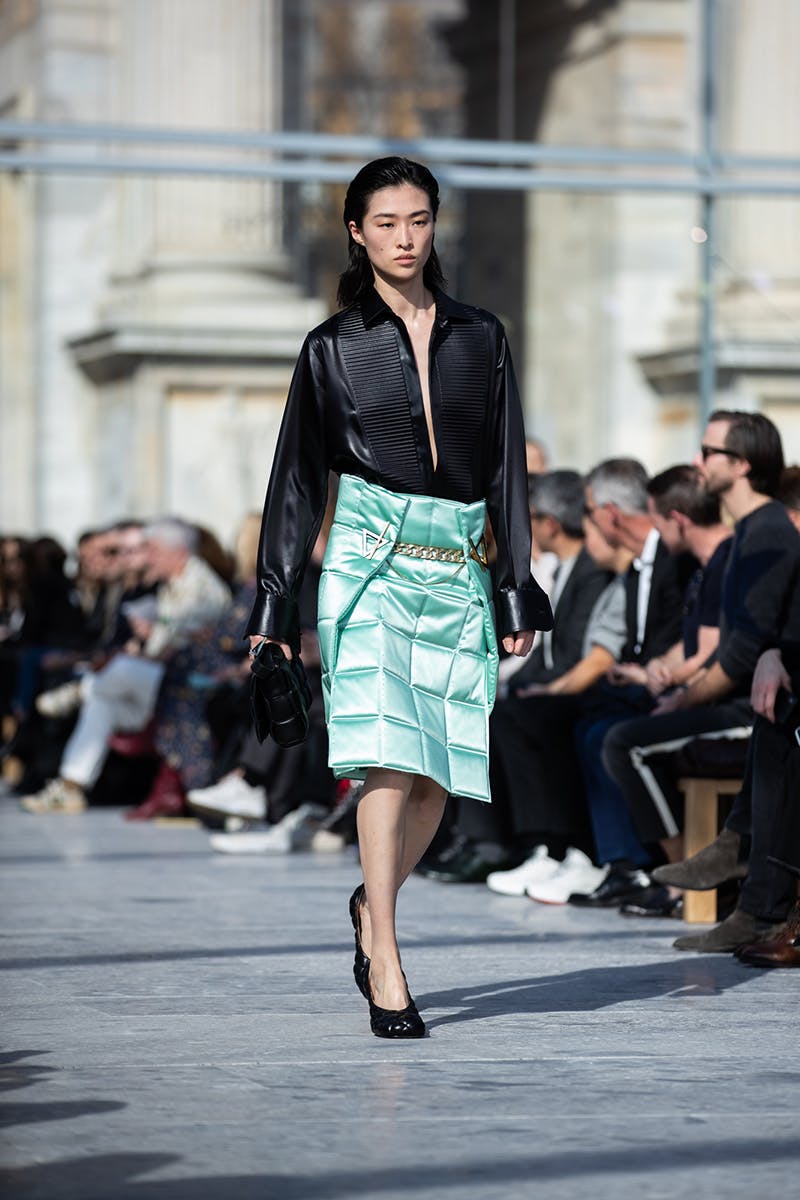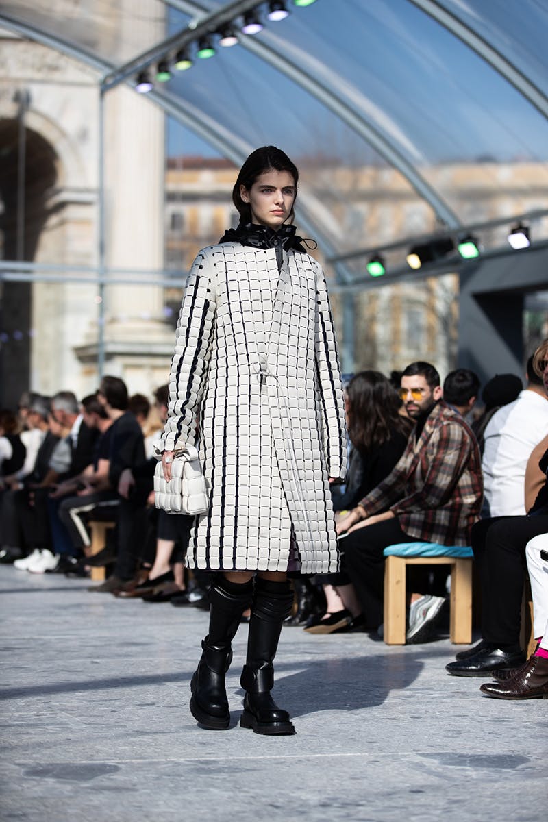 For menswear, desire and beauty came in the form of leather pants (which arrived in quilted and weaved variations), large cloak-like coats with distinct triangular detailing, sheer polo necks, and knitwear with cut-outs from the chest and hips. This freedom to expose the skin and fabrics underneath, married with super long sleeves and futuristic boots, sealed the new Bottega silhouette as one that signals a feeling of protection and, paradoxically, unrepentant vulnerability.